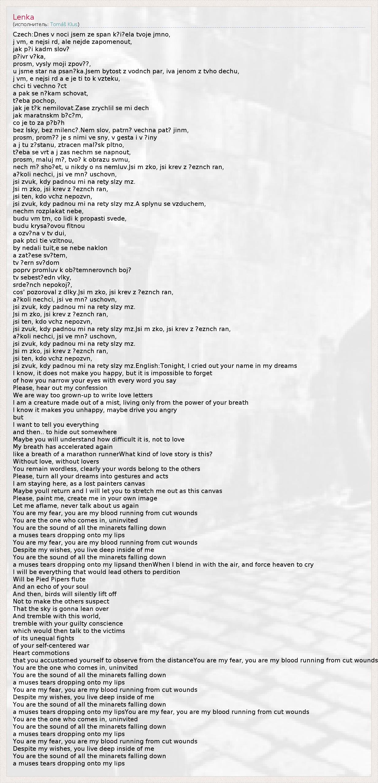 Czech:Dnes v noci jsem ze span k?i?ela tvoje jmno, j vm, e nejsi rd, ale nejde zapomenout, jak p?i kadm slov? p?ivr v?ka, prosm, vysly moji zpov??, u jsme star na psan?ka.Jsem bytost z vodnch par, iva jenom z tvho dechu, j vm, e nejsi rd a e je ti to k vzteku, chci ti vechno ?ct a pak se n?kam schovat, t?eba pochop, jak je t?k nemilovat.Zase zrychlil se mi dech jak maratnskm b?c?m, co je to za p?b?h bez lsky, bez milenc?.Nem slov, patrn? vechna pat? jinm, prosm, prom?? je s nimi ve sny, v gesta i v ?iny a j tu z?stanu, ztracen mal?sk pltno, t?eba se vrt a j zas nechm se napnout, prosm, maluj m?, tvo? k obrazu svmu, nech m? sho?et, u nikdy o ns nemluv.Jsi m zko, jsi krev z ?eznch ran, a?koli nechci, jsi ve mn? uschovn, jsi zvuk, kdy padnou mi na rety slzy mz. Jsi m zko, jsi krev z ?eznch ran, jsi ten, kdo vchz nepozvn, jsi zvuk, kdy padnou mi na rety slzy mz.A splynu se vzduchem, nechm rozplakat nebe, budu vm tm, co lidi k propasti svede, budu krysa?ovou fltnou a ozv?na v tv dui, pak ptci tie vzltnou, by nedali tuit,e se nebe naklon a zat?ese sv?tem, tv ?ern sv?dom poprv promluv k ob?temnerovnch boj? tv sebest?edn vlky, srde?nch nepokoj?, cos' pozoroval z dlky.Jsi m zko, jsi krev z ?eznch ran, a?koli nechci, jsi ve mn? uschovn, jsi zvuk, kdy padnou mi na rety slzy mz. Jsi m zko, jsi krev z ?eznch ran, jsi ten, kdo vchz nepozvn, jsi zvuk, kdy padnou mi na rety slzy mz.Jsi m zko, jsi krev z ?eznch ran, a?koli nechci, jsi ve mn? uschovn, jsi zvuk, kdy padnou mi na rety slzy mz. Jsi m zko, jsi krev z ?eznch ran, jsi ten, kdo vchz nepozvn, jsi zvuk, kdy padnou mi na rety slzy mz.English:Tonight, I cried out your name in my dreams I know, it does not make you happy, but it is impossible to forget of how you narrow your eyes with every word you say Please, hear out my confession We are way too grown-up to write love letters I am a creature made out of a mist, living only from the power of your breath I know it makes you unhappy, maybe drive you angry but I want to tell you everything and then.. to hide out somewhere Maybe you will understand how difficult it is, not to love My breath has accelerated again like a breath of a marathon runnerWhat kind of love story is this? Without love, without lovers You remain wordless, clearly your words belong to the others Please, turn all your dreams into gestures and acts I am staying here, as a lost painters canvas Maybe youll return and I will let you to stretch me out as this canvas Please, paint me, create me in your own image Let me aflame, never talk about us again You are my fear, you are my blood running from cut wounds You are the one who comes in, uninvited You are the sound of all the minarets falling down a muses tears dropping onto my lips You are my fear, you are my blood running from cut wounds Despite my wishes, you live deep inside of me You are the sound of all the minarets falling down a muses tears dropping onto my lipsand thenWhen I blend in with the air, and force heaven to cry I will be everything that would lead others to perdition Will be Pied Pipers flute And an echo of your soul And then, birds will silently lift off Not to make the others suspect That the sky is gonna lean over And tremble with this world, tremble with your guilty conscience which would then talk to the victims of its unequal fights of your self-centered war Heart commotions that you accustomed yourself to observe from the distanceYou are my fear, you are my blood running from cut wounds You are the one who comes in, uninvited You are the sound of all the minarets falling down a muses tears dropping onto my lips You are my fear, you are my blood running from cut wounds Despite my wishes, you live deep inside of me You are the sound of all the minarets falling down a muses tears dropping onto my lipsYou are my fear, you are my blood running from cut wounds You are the one who comes in, uninvited You are the sound of all the minarets falling down a muses tears dropping onto my lips You are my fear, you are my blood running from cut wounds Despite my wishes, you live deep inside of me You are the sound of all the minarets falling down a muses tears dropping onto my lips