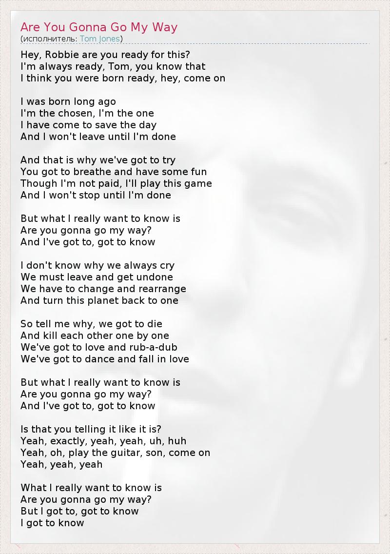 Hey, Robbie are you ready for this? I'm always ready, Tom, you know that I think you were born ready, hey, come on I was born long ago I'm the chosen, I'm the one I have come to save the day And I won't leave until I'm done And that is why we've got to try You got to breathe and have some fun Though I'm not paid, I'll play this game And I won't stop until I'm done But what I really want to know is Are you gonna go my way? And I've got to, got to know I don't know why we always cry We must leave and get undone We have to change and rearrange And turn this planet back to one So tell me why, we got to die And kill each other one by one We've got to love and rub-a-dub We've got to dance and fall in love But what I really want to know is Are you gonna go my way? And I've got to, got to know Is that you telling it like it is? Yeah, exactly, yeah, yeah, uh, huh Yeah, oh, play the guitar, son, come on Yeah, yeah, yeah What I really want to know is Are you gonna go my way? But I got to, got to know I got to know