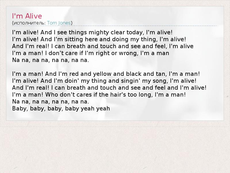 I'm alive! And I'm doin' my thing and singin' my song, I'm alive!