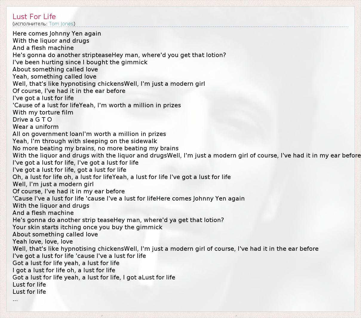 'Cause I've a lust for life 'cause I've a lust for lifeHere comes Johnny Yen again