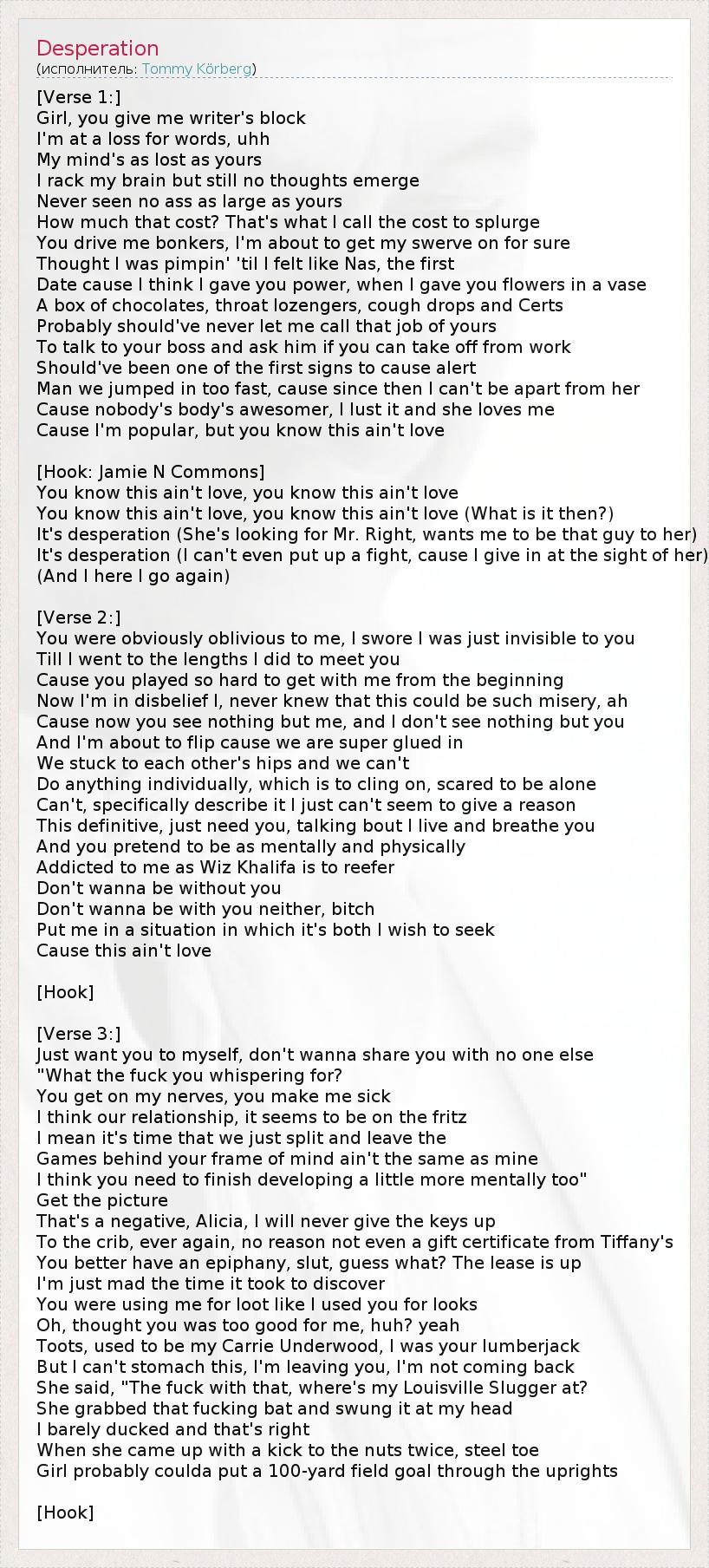 [Куплет 1:] Девка, ты вогнала меня в ступор, Я потерял дар речи... эммм... 1 Я одурел, ты тоже. Ломаю голову, но все же мыслей нет. Никогда не видел такой грандиозной ж*пы. 2 Сколько стоит? Наверное столько, сколько мне нужно за нее отвалить. 3 Ты сводишь меня с ума, я стопроцентно оттянусь по полной. 4 Думал, что использую тебя, пока не почувствовал себя как Нас на первом свидании. Наверное, одарил тебя силой, 5 когда дарил тебе цветы, Коробки шоколадных конфет, леденцы от боли в горле, капли от кашля и Сёртс. 6 Возможно, мне не нужно было звонить тебе на работу, Говорить с начальником и просить его отпустить тебя с работы. Это был один из первых признаков того, что нам нужно расстаться. 7 Мы с тобой сильно поспешили, ведь с тех пор я не могу тебя забыть. Нет тела круче, чем твоё, я жажду его, а ты меня любишь, Потому что я популярен, но знаешь, любви-то и близко нет. 8 [Припев: Jamie N Commons] Ты знаешь, любви и близко нет, любви нет. Ты знаешь, любви и близко нет, любви нет. (А что же есть тогда?) Отчаяние (Ей нужен принц на белом коне; 9 хочет, чтобы я им стал) Отчаяние (Я не могу сопротивляться, поддаюсь, когда вижу ее) (И все повторятся опять) 10 [Куплет 2:] Очевидно, ты не замечала меня, я клялся, что был невидим для тебя, Пока не сделал все, что должен был, ради встречи с тобой, 11 Потому что ты уж сильно заигрывала со мной с самого начала. Я в недоумении теперь, никогда не думал, что это может принести столько горя, ай. Сейчас ты не видишь ничего кроме меня, а я ничего кроме тебя, И я собираюсь оторваться от тебя, мы сильно склеены, Прилипли бедрами друг к другу, не можем Сделать что-то сами, прицеплены и боимся остаться одни. Не могу все это конкретно описать и похоже просто не могу найти причину, Определение, просто ты мне нужна, я живу и дышу тобой. А ты прикидываешься морально и физически, Что одержима мной, как Wiz Khalifa травой. 12 Не хочу быть с тобой, Но и не хочу быть без тебя, с*ка. Ты вогнала меня в ситуацию, где я хочу все это сразу, 13 Потому что любви нет... [Припев] [Куплет 3:] Просто хочу тебя рядом с собой, не хочу делить тебя ни с кем. 14 "Какого х*я ты там что-то шепчешь? Ты меня бесишь, тянет рвать. Наши отношения, по ходу, барахлят. 15 Я хочу сказать, что просто нам пора расстаться, Поиграли и хватит, мы не сошлись характерами. Я думаю, тебе нужно немного повзрослеть и поумнеть". Секи, вот такой расклад. 16 Для тебя он плох, Алиша - я никогда не дам тебе ключей От дома снова, 17 и нет смысла в подарочном талоне от Тиффани. 18 Тебе лучше прозреть, шл*ха. Знаешь что? Срок аренды вышел, Я просто зол, что столько времени потратил, прежде чем до меня это дошло. 19 Ты меня использовала ради наживы, как я использовал тебя из-за твоей внешности. Оу, думала, ты для меня слишком хороша, а? Конечно. Дорогуша, ты была моей Кэрри Андервуд, я был твои дровосеком. 20 Но мне тошнит от этого, я ухожу и никогда не вернусь. Она в ответ: "Ах ты бл*, где моя Луисвилл Слаггер?" Схватила эту чертову биту и решила шандарахнуть меня по голове. 21 Я еле увернулся, и это хорошо. Тогда она ударила меня по яйцам дважды, стальным подноском, так сильно, что, Возможно, она могла бы забить мяч в ворота с другого конца поля. 22 [Припев] 1 — writer's block — творческий кризис, отсутствие вдохновения. Но в данном случае причиной его творческого кризиса является девушка, поэтому словосочетание используется в переносном смысле. Он не знал, что сказать, когда встретил дев