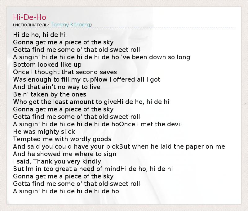 Hi de ho, hi de hi Gonna get me a piece of the sky Gotta find me some o' that old sweet roll A singin' hi de hi de hi de hi de hoI've been down so long Bottom looked like up Once I thought that second saves Was enough to fill my cupNow I offered all I got And that ain't no way to live Bein' taken by the ones Who got the least amount to giveHi de ho, hi de hi Gonna get me a piece of the sky Gotta find me some o' that old sweet roll A singin' hi de hi de hi de hi de hoOnce I met the devil He was mighty slick Tempted me with wordly goods And said you could have your pickBut when he laid the paper on me And he showed me where to sign I said, Thank you very kindly But Im in too great a need of mindHi de ho, hi de hi Gonna get me a piece of the sky Gotta find me some o' that old sweet roll A singin' hi de hi de hi de hi de ho