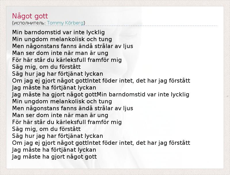 Min barndomstid var inte lycklig Min ungdom melankolisk och tung Men någonstans fanns ändå strålar av ljus Man ser dom inte när man är ung För här står du kärleksfull framför mig Säg mig, om du förstått Säg hur jag har förtjänat lyckan Om jag ej gjort något gottIntet föder intet, det har jag förstått Jag måste ha förtjänat lyckan Jag måste ha gjort något gottMin barndomstid var inte lycklig Min ungdom melankolisk och tung Men någonstans fanns ändå strålar av ljus Man ser dom inte när man är ung För här står du kärleksfull framför mig Säg mig, om du förstått Säg hur jag har förtjänat lyckan Om jag ej gjort något gottIntet föder intet, det har jag förstått Jag måste ha förtjänat lyckan Jag måste ha gjort något gott