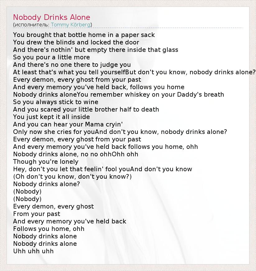 You brought that bottle home in a paper sack You drew the blinds and locked the door And there's nothin' but empty there inside that glass So you pour a little more And there's no one there to judge you At least that's what you tell yourselfBut don't you know, nobody drinks alone? Every demon, every ghost from your past And every memory you've held back, follows you home Nobody drinks aloneYou remember whiskey on your Daddy's breath So you always stick to wine And you scared your little brother half to death You just kept it all inside And you can hear your Mama cryin' Only now she cries for youAnd don't you know, nobody drinks alone? Every demon, every ghost from your past And every memory you've held back follows you home, ohh Nobody drinks alone, no no ohhOhh ohh Though you're lonely Hey, don't you let that feelin' fool youAnd don't you know (Oh don't you know, don't you know?) Nobody drinks alone? (Nobody) (Nobody) Every demon, every ghost From your past And every memory you've held back Follows you home, ohh Nobody drinks alone Nobody drinks alone Uhh uhh uhh