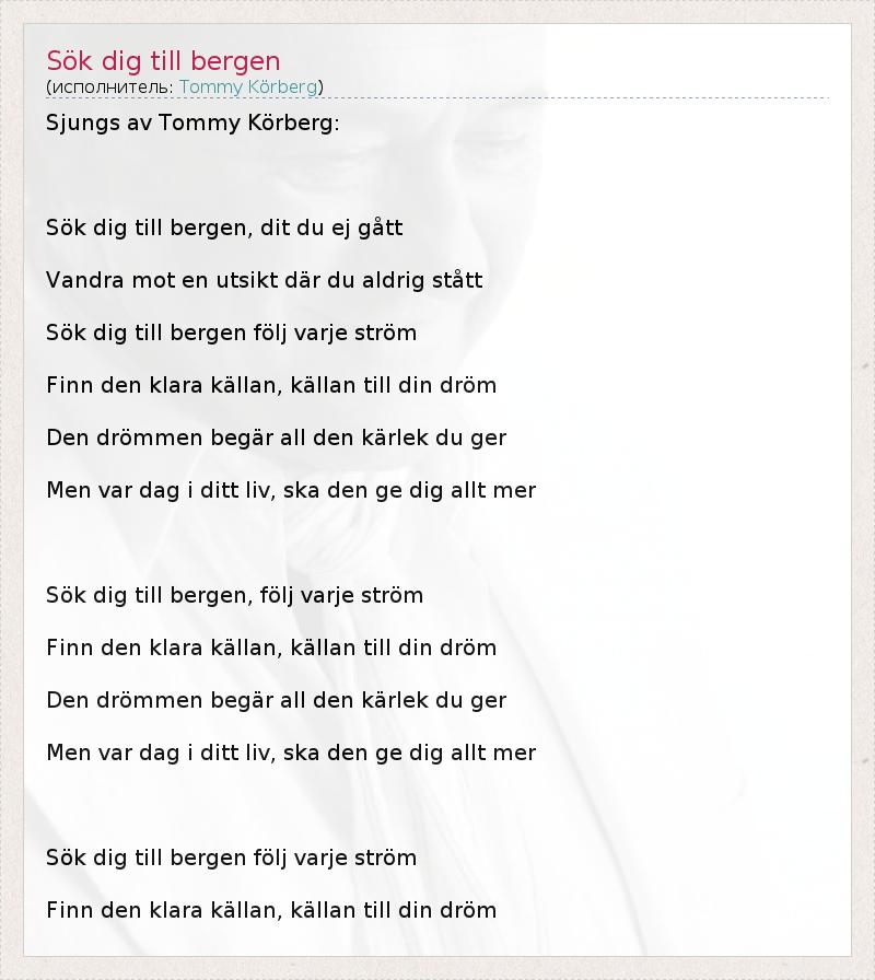Sjungs av Tommy Körberg: Sök dig till bergen, dit du ej gått Vandra mot en utsikt där du aldrig stått Sök dig till bergen följ varje ström Finn den klara källan, källan till din dröm Den drömmen begär all den kärlek du ger Men var dag i ditt liv, ska den ge dig allt mer Sök dig till bergen, följ varje ström Finn den klara källan, källan till din dröm Den drömmen begär all den kärlek du ger Men var dag i ditt liv, ska den ge dig allt mer Sök dig till bergen följ varje ström Finn den klara källan, källan till din dröm