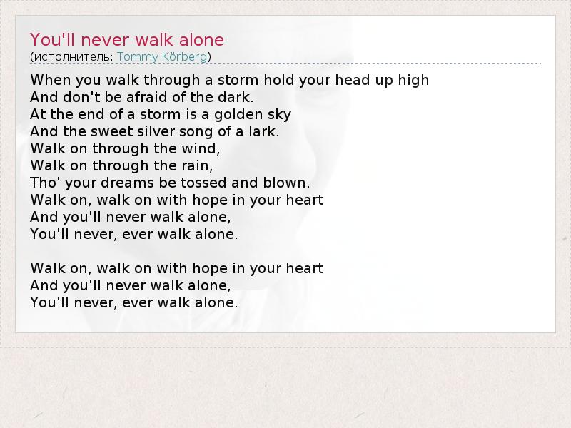 Ты никогда не будешь один Когда ты идешь сквозь шторм, Держи голову высоко И не бойся тьмы. В конце шторма Тебя ждет золотое небо И сладкоголосая трель жаворонка. Иди сквозь ветер. Иди сквозь дождь, Несмотря на то, что твои мечты Бросает из стороны в сторону. Иди. Иди. Когда ты идешь сквозь шторм, Держи голову высоко И не бойся тьмы. В конце шторма Тебя ждет золотое небо И сладкоголосая трель жаворонка. Иди сквозь ветер. Иди сквозь дождь, Несмотря на то, что твои мечты Бросает из стороны в сторону. Иди. Иди с надеждой, С надеждой в своем сердце и ты никогда не будешь в одиночестве. Ты никогда не будешь один. Ты никогда не будешь идти один. Песня была написана Ричардом Роджерсом (Richard Rogers) в 1945 г. Стала известной благодаря исполнению такими певцами как Элвис Пресли и Фрэнк Синатра. Является гимном болельщиков футбольного клуба "Ливерпуль".