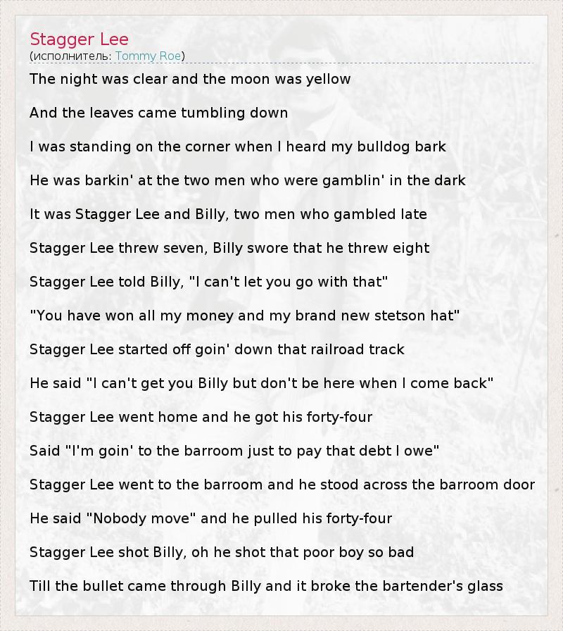 The night was clear and the moon was yellow And the leaves came tumbling down I was standing on the corner when I heard my bulldog bark He was barkin' at the two men who were gamblin' in the dark It was Stagger Lee and Billy, two men who gambled late Stagger Lee threw seven, Billy swore that he threw eight Stagger Lee told Billy, "I can't let you go with that" "You have won all my money and my brand new stetson hat" Stagger Lee started off goin' down that railroad track He said "I can't get you Billy but don't be here when I come back" Stagger Lee went home and he got his forty-four Said "I'm goin' to the barroom just to pay that debt I owe" Stagger Lee went to the barroom and he stood across the barroom door He said "Nobody move" and he pulled his forty-four Stagger Lee shot Billy, oh he shot that poor boy so bad Till the bullet came through Billy and it broke the bartender's glass