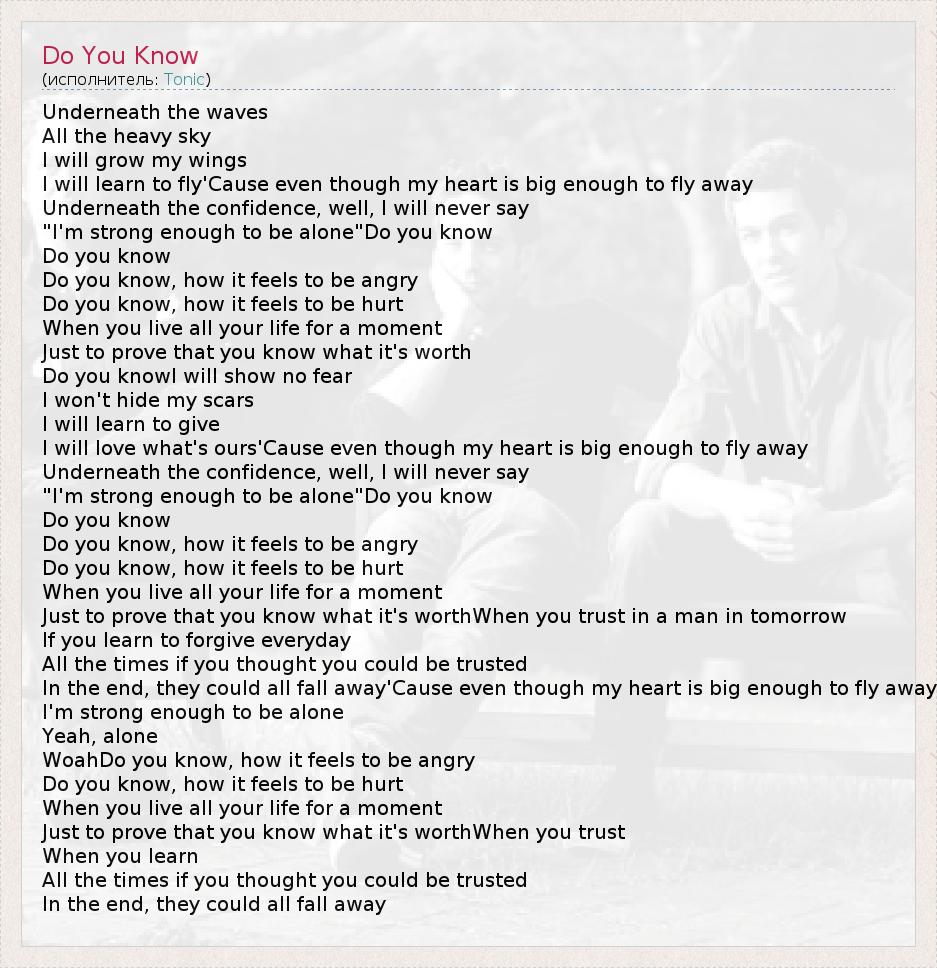 Underneath the waves All the heavy sky I will grow my wings I will learn to fly'Cause even though my heart is big enough to fly away Underneath the confidence, well, I will never say "I'm strong enough to be alone"Do you know Do you know Do you know, how it feels to be angry Do you know, how it feels to be hurt When you live all your life for a moment Just to prove that you know what it's worth Do you knowI will show no fear I won't hide my scars I will learn to give I will love what's ours'Cause even though my heart is big enough to fly away Underneath the confidence, well, I will never say "I'm strong enough to be alone"Do you know Do you know Do you know, how it feels to be angry Do you know, how it feels to be hurt When you live all your life for a moment Just to prove that you know what it's worthWhen you trust in a man in tomorrow If you learn to forgive everyday All the times if you thought you could be trusted In the end, they could all fall away'Cause even though my heart is big enough to fly away I'm strong enough to be alone Yeah, alone WoahDo you know, how it feels to be angry Do you know, how it feels to be hurt When you live all your life for a moment Just to prove that you know what it's worthWhen you trust When you learn All the times if you thought you could be trusted In the end, they could all fall away