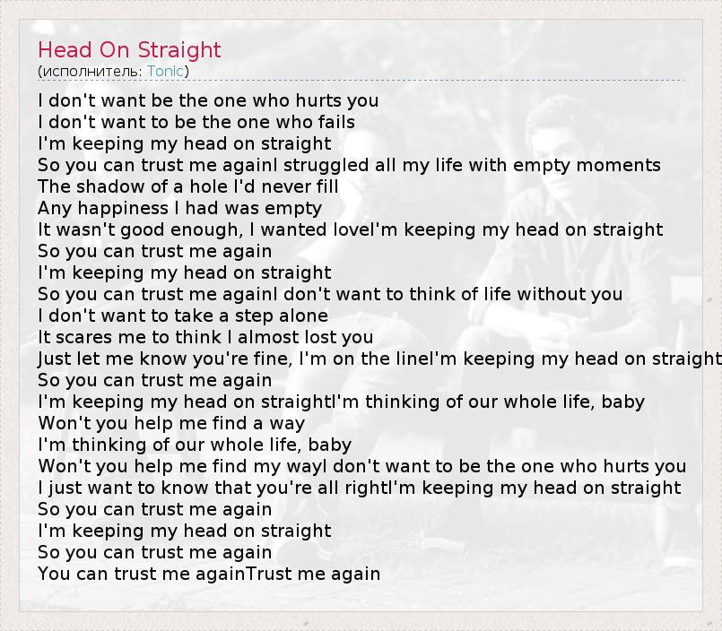 I don't want be the one who hurts you I don't want to be the one who fails I'm keeping my head on straight So you can trust me againI struggled all my life with empty moments The shadow of a hole I'd never fill Any happiness I had was empty It wasn't good enough, I wanted loveI'm keeping my head on straight So you can trust me again I'm keeping my head on straight So you can trust me againI don't want to think of life without you I don't want to take a step alone It scares me to think I almost lost you Just let me know you're fine, I'm on the lineI'm keeping my head on straight So you can trust me again I'm keeping my head on straightI'm thinking of our whole life, baby Won't you help me find a way I'm thinking of our whole life, baby Won't you help me find my wayI don't want to be the one who hurts you I just want to know that you're all rightI'm keeping my head on straight So you can trust me again I'm keeping my head on straight So you can trust me again You can trust me againTrust me again
