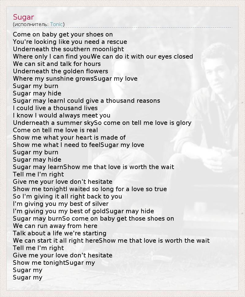 Come on baby get your shoes on You're looking like you need a rescue Underneath the southern moonlight Where only I can find youWe can do it with our eyes closed We can sit and talk for hours Underneath the golden flowers Where my sunshine growsSugar my love Sugar my burn Sugar may hide Sugar may learnI could give a thousand reasons I could live a thousand lives I know I would always meet you Underneath a summer skySo come on tell me love is glory Come on tell me love is real Show me what your heart is made of Show me what I need to feelSugar my love Sugar my burn Sugar may hide Sugar may learnShow me that love is worth the wait Tell me I'm right Give me your love don't hesitate Show me tonightI waited so long for a love so true So I'm giving it all right back to you I'm giving you my best of silver I'm giving you my best of goldSugar may hide Sugar may burnSo come on baby get those shoes on We can run away from here Talk about a life we're starting We can start it all right hereShow me that love is worth the wait Tell me I'm right Give me your love don't hesitate Show me tonightSugar my Sugar my Sugar my