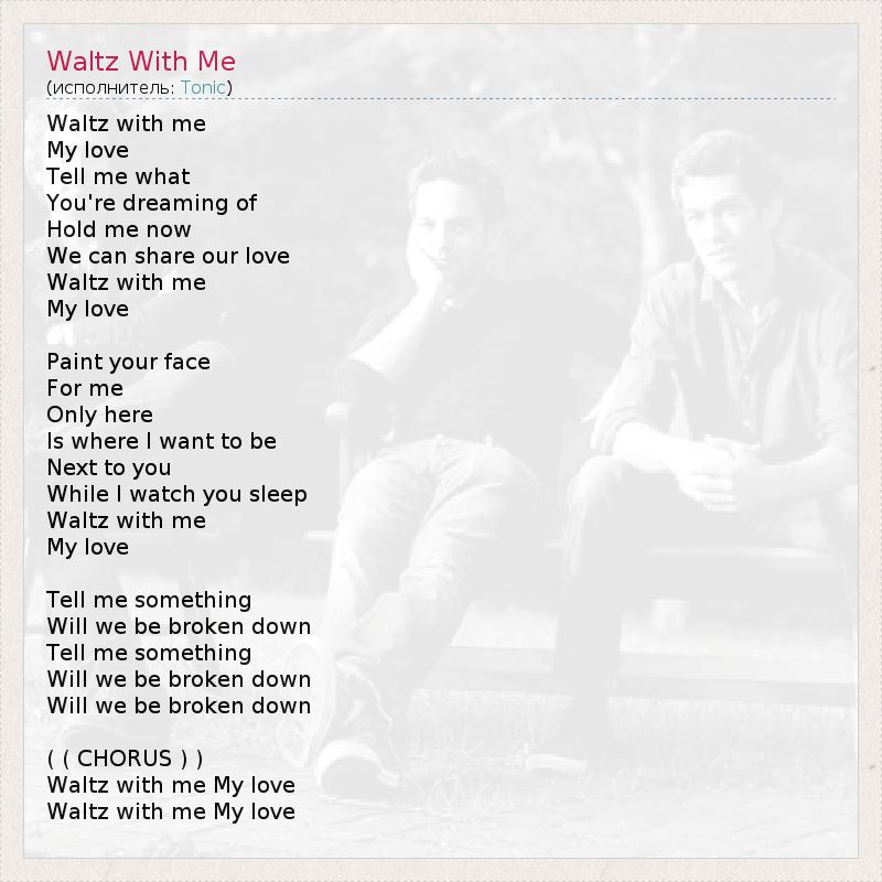 Waltz with me My love Tell me what You're dreaming of Hold me now We can share our love Waltz with me My love Paint your face For me Only here Is where I want to be Next to you While I watch you sleep Waltz with me My love Tell me something Will we be broken down Tell me something Will we be broken down Will we be broken down ( ( CHORUS ) ) Waltz with me My love Waltz with me My love