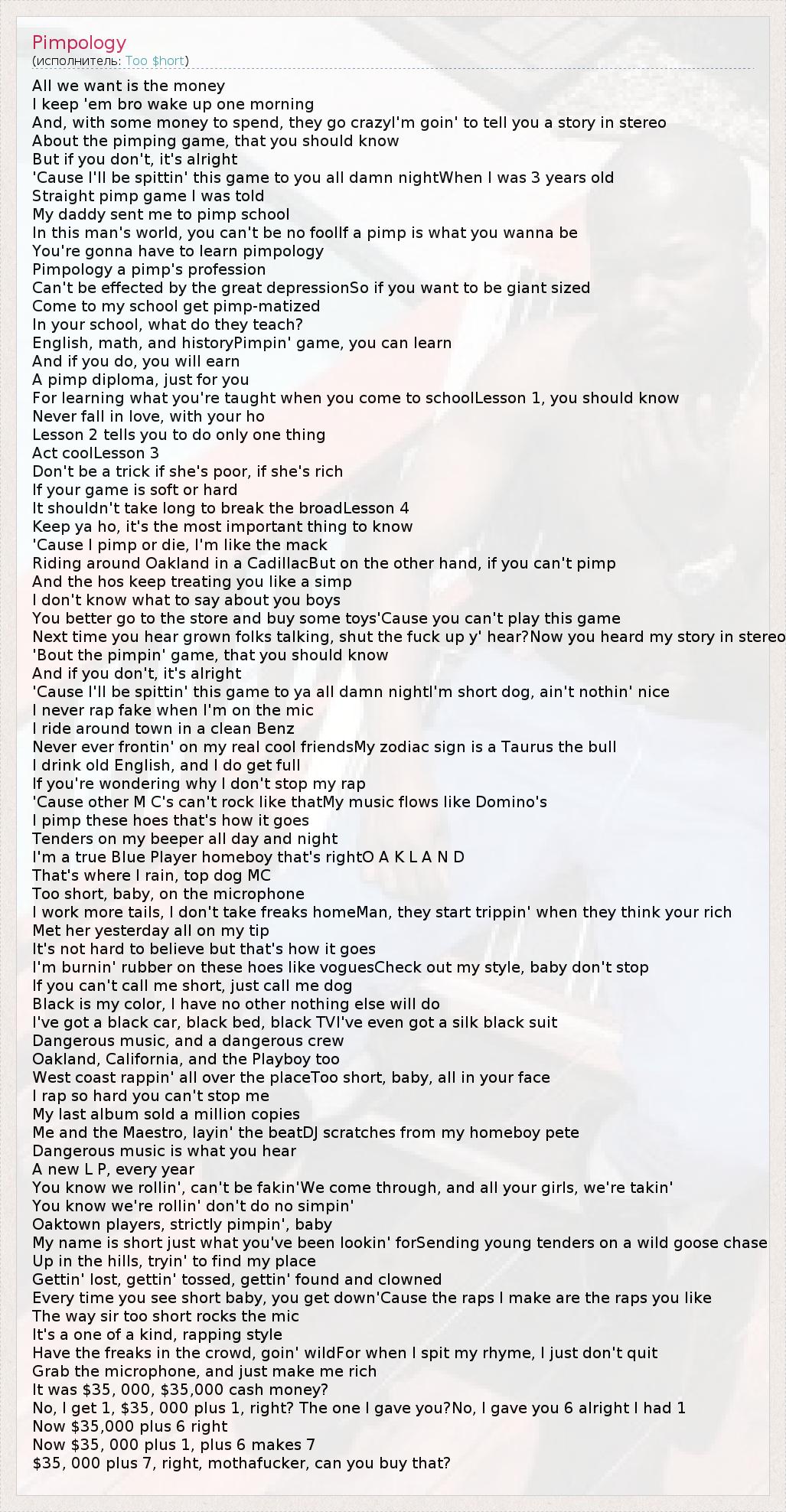 Это интересно:Too Short является выходцем из Оукленда. Стал первой рэп звездой с западного побережья, записав самостоятельно три альбома. После чего в 1988 году на крупном лейбле он выпускает свой первый альбом, достигший золотого статуса, под названием "Born To Mack". Четыре следующих альбома достигли платинового статуса. Упредив большинство будущих гэнгста рэпперов, он ограничивался рассказами о сексе... продолжение