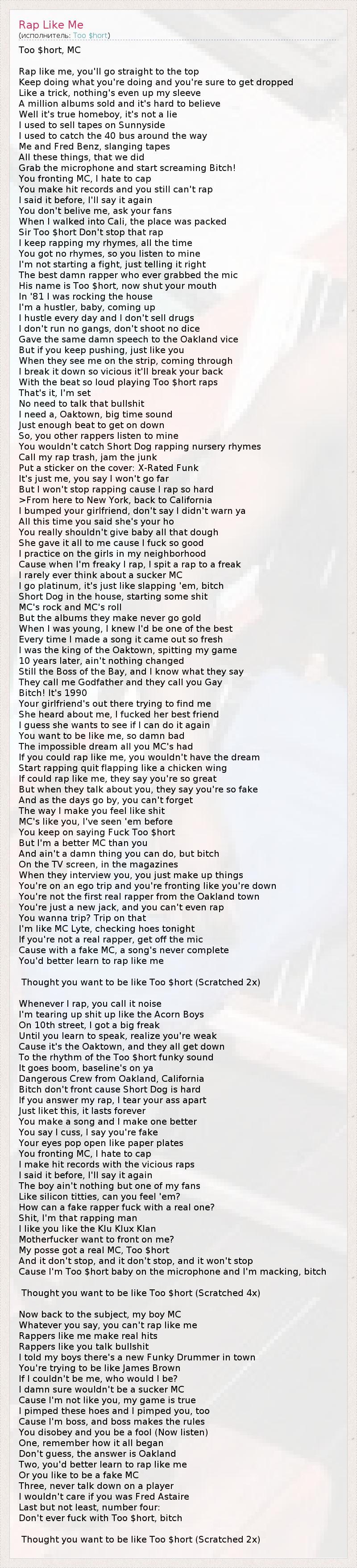 Too $hort, MC Rap like me, you'll go straight to the top Keep doing what you're doing and you're sure to get dropped Like a trick, nothing's even up my sleeve A million albums sold and it's hard to believe Well it's true homeboy, it's not a lie I used to sell tapes on Sunnyside I used to catch the 40 bus around the way Me and Fred Benz, slanging tapes All these things, that we did Grab the microphone and start screaming Bitch! You fronting MC, I hate to cap You make hit records and you still can't rap I said it before, I'll say it again You don't belive me, ask your fans When I walked into Cali, the place was packed Sir Too $hort Don't stop that rap I keep rapping my rhymes, all the time You got no rhymes, so you listen to mine I'm not starting a fight, just telling it right The best damn rapper who ever grabbed the mic His name is Too $hort, now shut your mouth In '81 I was rocking the house I'm a hustler, baby, coming up I hustle every day and I don't sell drugs I don't run no gangs, don't shoot no dice Gave the same damn speech to the Oakland vice But if you keep pushing, just like you When they see me on the strip, coming through I break it down so vicious it'll break your back With the beat so loud playing Too $hort raps That's it, I'm set No need to talk that bullshit I need a, Oaktown, big time sound Just enough beat to get on down So, you other rappers listen to mine You wouldn't catch Short Dog rapping nursery rhymes Call my rap trash, jam the junk Put a sticker on the cover: X-Rated Funk It's just me, you say I won't go far But I won't stop rapping cause I rap so hard >From here to New York, back to California I bumped your girlfriend, don't say I didn't warn ya All this time you said she's your ho You really shouldn't give baby all that dough She gave it all to me cause I fuck so good I practice on the girls in my neighborhood Cause when I'm freaky I rap, I spit a rap to a freak I rarely ever think about a sucker MC I go platinum, it's just like slapping 'em, bitch Short Dog in the house, starting some shit MC's rock and MC's roll But the albums they make never go gold When I was young, I knew I'd be one of the best Every time I made a song it came out so fresh I was the king of the Oaktown, spitting my game 10 years later, ain't nothing changed Still the Boss of the Bay, and I know what they say They call me Godfather and they call you Gay Bitch! It's 1990 Your girlfriend's out there trying to find me She heard about me, I fucked her best friend I guess she wants to see if I can do it again You want to be like me, so damn bad The impossible dream all you MC's had If you could rap like me, you wouldn't have the dream Start rapping quit flapping like a chicken wing If could rap like me, they say you're so great But when they talk about you, they say you're so fake And as the days go by, you can't forget The way I make you feel like shit MC's like you, I've seen 'em before You keep on saying Fuck Too $hort But I'm a better MC than you And ain't a damn thing you can do, but bitch On the TV screen, in the magazines When they interview you, you just make up things You're on an ego trip and you're fronting like you're down You're not the first real rapper from the Oakland town You're just a new jack, and you can't even rap You wanna trip? Trip on that I'm like MC Lyte, checking hoes tonight If you're not a real rapper, get off the mic Cause with a fake MC, a song's never complete You'd better learn to rap like me Thought you want to be like Too $hort (Scratched 2x) Whenever I rap, you call it noise I'm tearing up shit up like the Acorn Boys On 10th street, I got a big freak Until you learn to speak, realize you're weak Cause it's the Oaktown, and they all get down To the rhythm of the Too $hort funky sound It goes boom, baseline's on ya Dangerous Crew from Oakland, California Bitch don't front cause Short Dog is hard If you answer my rap, I tear your ass apart Just liket this, it lasts forever You make a song and I make one better You say I cuss, I say you're fake Your eyes pop open like paper plates You fronting MC, I hate to cap I make hit records with the vicious raps I said it before, I'll say it again The boy ain't nothing but one of my fans Like silicon titties, can you feel 'em? How can a fake rapper fuck with a real one? Shit, I'm that rapping man I like you like the Klu Klux Klan Motherfucker want to front on me? My posse got a real MC, Too $hort And it don't stop, and it don't stop, and it won't stop Cause I'm Too $hort baby on the microphone and I'm macking, bitch Thought you want to be like Too $hort (Scratched 4x) Now back to the subject, my boy MC Whatever you say, you can't rap like me Rappers like me make real hits Rappers like you talk bullshit I told my boys there's a new Funky Drummer in town You're trying to be like James Brown If I couldn't be me, who would I be? I damn sure wouldn't be a sucker MC Cause I'm not like you, my game is true I pimped these hoes and I pimped you, too Cause I'm boss, and boss makes the rules You disobey and you be a fool (Now listen) One, remember how it all began Don't guess, the answer is Oakland Two, you'd better learn to rap like me Or you like to be a fake MC Three, never talk down on a player I wouldn't care if you was Fred Astaire Last but not least, number four: Don't ever fuck with Too $hort, bitch Thought you want to be like Too $hort (Scratched 2x)
