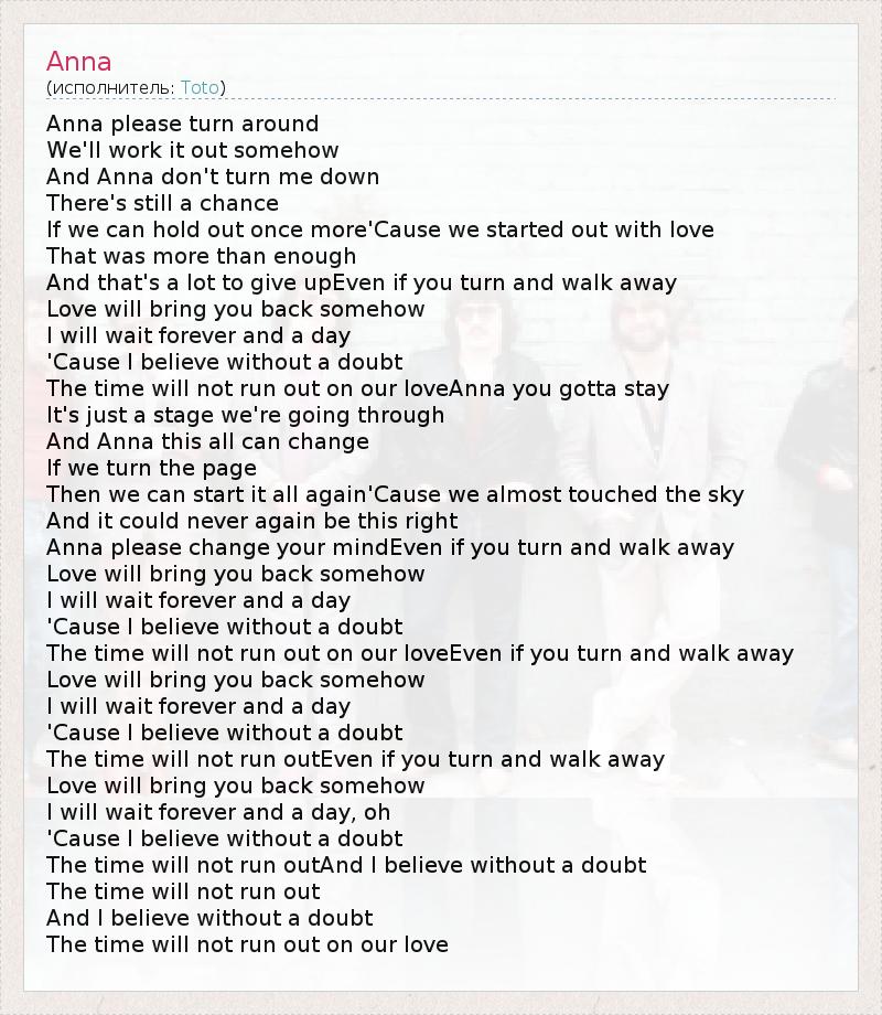 Anna please turn around We'll work it out somehow And Anna don't turn me down There's still a chance If we can hold out once more'Cause we started out with love That was more than enough And that's a lot to give upEven if you turn and walk away Love will bring you back somehow I will wait forever and a day 'Cause I believe without a doubt The time will not run out on our loveAnna you gotta stay It's just a stage we're going through And Anna this all can change If we turn the page Then we can start it all again'Cause we almost touched the sky And it could never again be this right Anna please change your mindEven if you turn and walk away Love will bring you back somehow I will wait forever and a day 'Cause I believe without a doubt The time will not run out on our loveEven if you turn and walk away Love will bring you back somehow I will wait forever and a day 'Cause I believe without a doubt The time will not run outEven if you turn and walk away Love will bring you back somehow I will wait forever and a day, oh 'Cause I believe without a doubt The time will not run outAnd I believe without a doubt The time will not run out And I believe without a doubt The time will not run out on our love