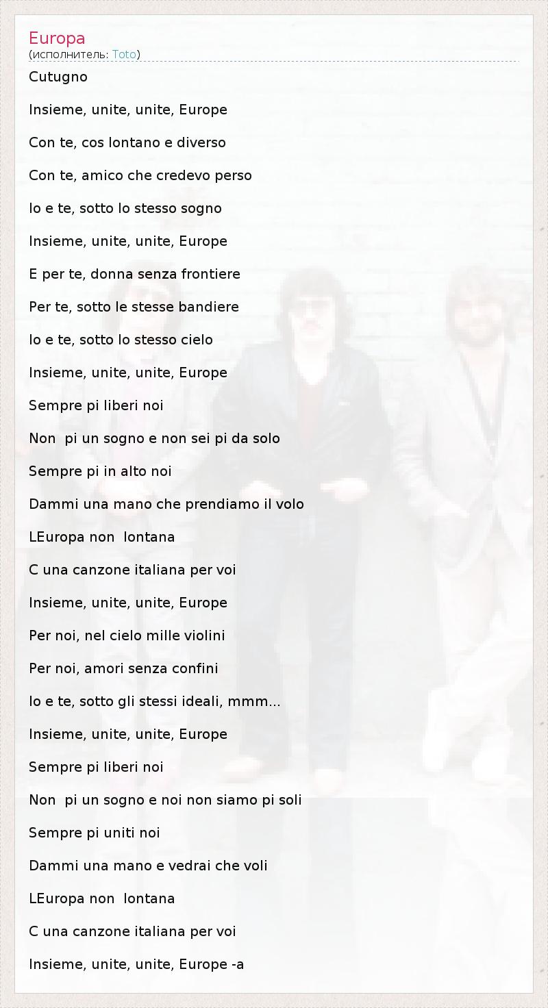 Это интересно:"Toto" были основаны в 1978 году Дэвидом Пэйчем (р. 21 июня 1954, Лос-Анджелес; клавишные, вокал), Стивом Люкатером (р. 21 октября 1957, Лос-Анджелес; гитара, вокал), Бобби Кимболлом (Роберт Тотекс, р. 29 марта 1947, Винтон; вокал), Стивом Покаро (р. 2 сентября 1957, Коннектикут; клавишные), Дэвидом Хангейтом (р. Техас; бас) и Джеффом Покаро (р. 1 апреля 1954, Хартфорд, у. 5 августа 1992; ударные). Дэвид был сыном аранжировщика... продолжение