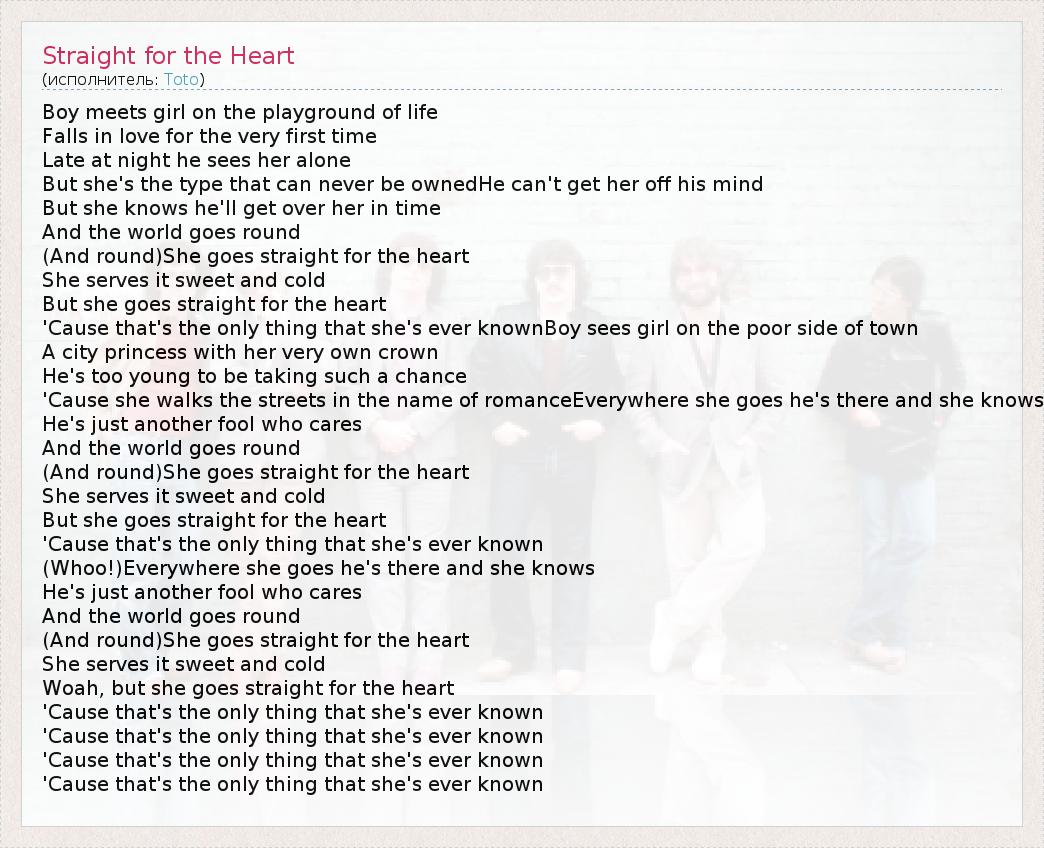 Boy meets girl on the playground of life Falls in love for the very first time Late at night he sees her alone But she's the type that can never be ownedHe can't get her off his mind But she knows he'll get over her in time And the world goes round (And round)She goes straight for the heart She serves it sweet and cold But she goes straight for the heart 'Cause that's the only thing that she's ever knownBoy sees girl on the poor side of town A city princess with her very own crown He's too young to be taking such a chance 'Cause she walks the streets in the name of romanceEverywhere she goes he's there and she knows He's just another fool who cares And the world goes round (And round)She goes straight for the heart She serves it sweet and cold But she goes straight for the heart 'Cause that's the only thing that she's ever known (Whoo!)Everywhere she goes he's there and she knows He's just another fool who cares And the world goes round (And round)She goes straight for the heart She serves it sweet and cold Woah, but she goes straight for the heart 'Cause that's the only thing that she's ever known 'Cause that's the only thing that she's ever known 'Cause that's the only thing that she's ever known 'Cause that's the only thing that she's ever known