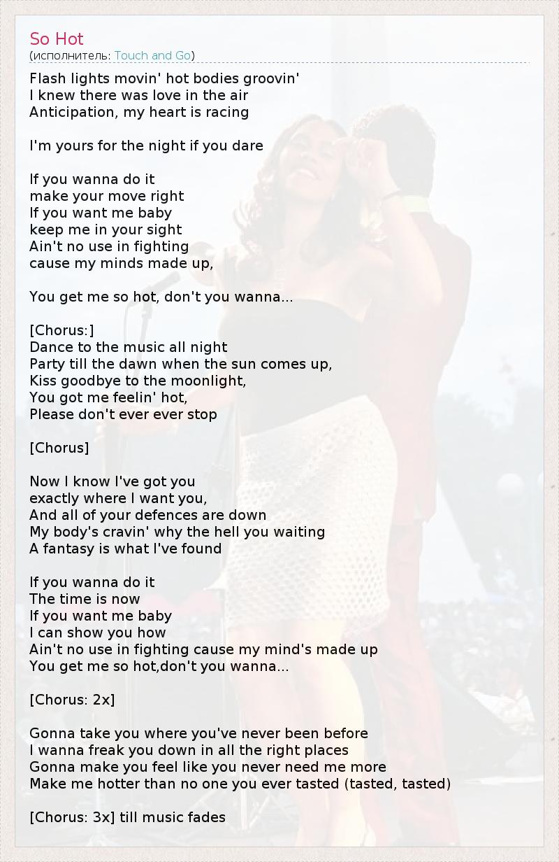 Flash lights movin' hot bodies groovin' I knew there was love in the air Anticipation, my heart is racing I'm yours for the night if you dare If you wanna do it make your move right If you want me baby keep me in your sight Ain't no use in fighting cause my minds made up, You get me so hot, don't you wanna... [Chorus:] Dance to the music all night Party till the dawn when the sun comes up, Kiss goodbye to the moonlight, You got me feelin' hot, Please don't ever ever stop [Chorus] Now I know I've got you exactly where I want you, And all of your defences are down My body's cravin' why the hell you waiting A fantasy is what I've found If you wanna do it The time is now If you want me baby I can show you how Ain't no use in fighting cause my mind's made up You get me so hot,don't you wanna... [Chorus: 2x] Gonna take you where you've never been before I wanna freak you down in all the right places Gonna make you feel like you never need me more Make me hotter than no one you ever tasted (tasted, tasted) [Chorus: 3x] till music fades