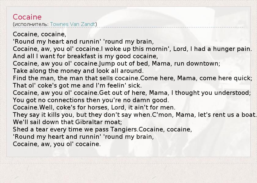 Cocaine, aw you ol' cocaine.Get out of here, Mama, I thought you understood;