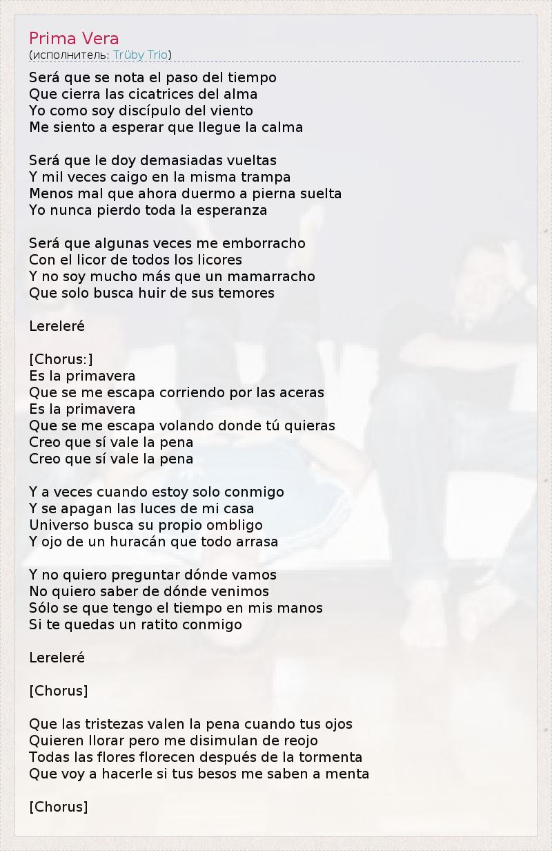 Возможно, что достижение - это течение времени, Которое скрывает шрамы души, Я - как ученик ветра, Я чувствую надежду, что дарит спокойствие. Возможно, что слишком много хожу вокруг И тысячу раз я попадаю в ту же самую ловушку, Хуже, что сейчас я сплю спокойно, 1 Я никогда не теряю надежды полностью. Возможно, что иногда я пьян От жидкости всех жидкостей, И я не более, чем чучело, Которое лишь ищет, как убежать от своих страхов. Ле-ре-ле-ре [Припев:] Это весна, Что ускользает от меня, бежит по тротуарам. Это весна, Что ускользает от меня, летит туда, куда ты захочешь. Я верю: да, это того стоит, Я верю: да, это того стоит. А иногда, когда я наедине с собой И гаснет свет в моём доме, Вселенная ищет свой собственный центр И источник урагана, который всё разрушает. И я не хочу спрашивать, куда мы идём, Не хочу знать, откуда мы приходим, Только знаю, что время в моих руках, Если ты остаёшься на мгновение со мной. Ле-ре-ле-ре [Припев] Что печали стоят того, что, когда твои глаза Хотят плакать, то скрывают это от меня, глядя искоса, Все цветы расцветают после грозы, Что я могу сделать с этим, если твои поцелуи со вкусом мяты? [Припев] 1 - a pierna suelta (досл.) – с освобожденной ногой