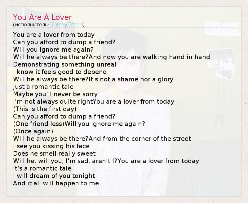 You are a lover from today Can you afford to dump a friend? Will you ignore me again? Will he always be there?And now you are walking hand in hand Demonstrating something unreal I know it feels good to depend Will he always be there?It's not a shame nor a glory Just a romantic tale Maybe you'll never be sorry I'm not always quite rightYou are a lover from today (This is the first day) Can you afford to dump a friend? (One friend less)Will you ignore me again? (Once again) Will he always be there?And from the corner of the street I see you kissing his face Does he smell really sweet Will he, will you, I'm sad, aren't I?You are a lover from today It's a romantic tale I will dream of you tonight And it all will happen to me