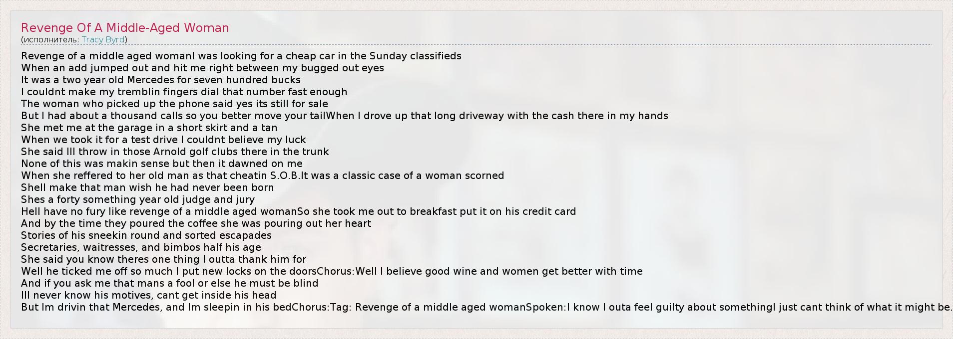 ГлавнаяИсполнителиTracy ByrdRevenge Of A Middle-Aged Woman