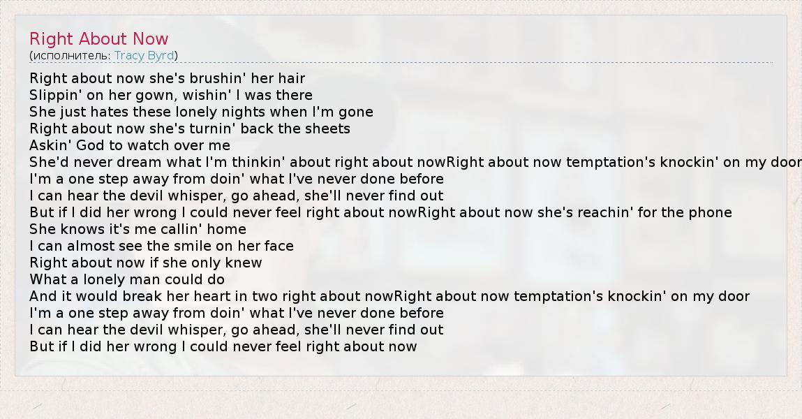 She'd never dream what I'm thinkin' about right about nowRight about now temptation's knockin' on my door