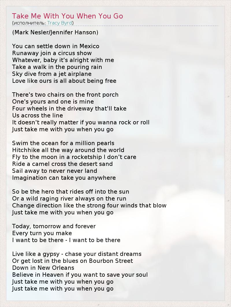 (Mark Nesler/Jennifer Hanson) You can settle down in Mexico Runaway join a circus show Whatever, baby it's alright with me Take a walk in the pouring rain Sky dive from a jet airplane Love like ours is all about being free There's two chairs on the front porch One's yours and one is mine Four wheels in the driveway that'll take Us across the line It doesn't really matter if you wanna rock or roll Just take me with you when you go Swim the ocean for a million pearls Hitchhike all the way around the world Fly to the moon in a rocketship I don't care Ride a camel cross the desert sand Sail away to never never land Imagination can take you anywhere So be the hero that rides off into the sun Or a wild raging river always on the run Change direction like the strong four winds that blow Just take me with you when you go Today, tomorrow and forever Every turn you make I want to be there - I want to be there Live like a gypsy - chase your distant dreams Or get lost in the blues on Bourbon Street Down in New Orleans Believe in Heaven if you want to save your soul Just take me with you when you go Just take me with you when you go