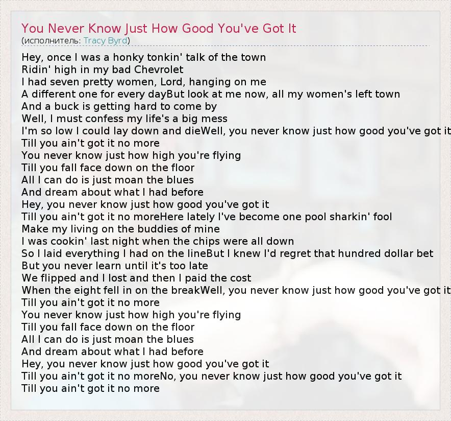 Hey, once I was a honky tonkin' talk of the town Ridin' high in my bad Chevrolet I had seven pretty women, Lord, hanging on me A different one for every dayBut look at me now, all my women's left town And a buck is getting hard to come by Well, I must confess my life's a big mess I'm so low I could lay down and dieWell, you never know just how good you've got it Till you ain't got it no more You never know just how high you're flying Till you fall face down on the floor All I can do is just moan the blues And dream about what I had before Hey, you never know just how good you've got it Till you ain't got it no moreHere lately I've become one pool sharkin' fool Make my living on the buddies of mine I was cookin' last night when the chips were all down So I laid everything I had on the lineBut I knew I'd regret that hundred dollar bet But you never learn until it's too late We flipped and I lost and then I paid the cost When the eight fell in on the breakWell, you never know just how good you've got it Till you ain't got it no more You never know just how high you're flying Till you fall face down on the floor All I can do is just moan the blues And dream about what I had before Hey, you never know just how good you've got it Till you ain't got it no moreNo, you never know just how good you've got it Till you ain't got it no more