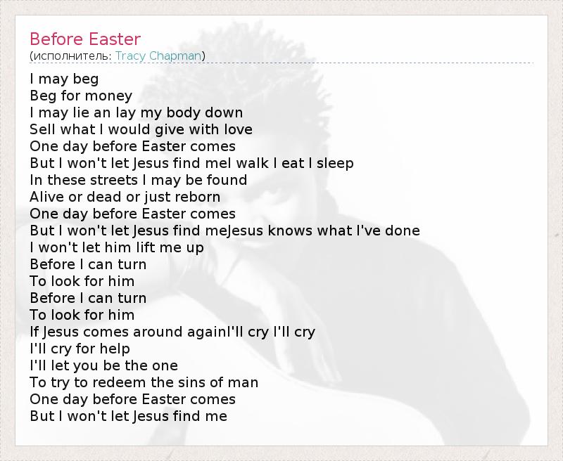 I may beg Beg for money I may lie an lay my body down Sell what I would give with love One day before Easter comes But I won't let Jesus find meI walk I eat I sleep In these streets I may be found Alive or dead or just reborn One day before Easter comes But I won't let Jesus find meJesus knows what I've done I won't let him lift me up Before I can turn To look for him Before I can turn To look for him If Jesus comes around againI'll cry I'll cry I'll cry for help I'll let you be the one To try to redeem the sins of man One day before Easter comes But I won't let Jesus find me