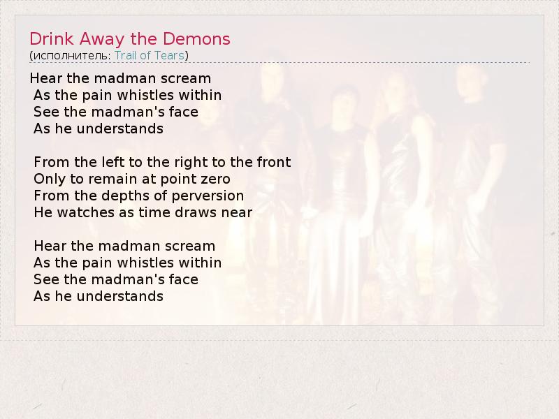А как ты думаешь, о чем песня "Drink Away the Demons" ?