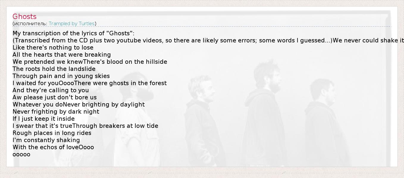 My transcription of the lyrics of "Ghosts": (Transcribed from the CD plus two youtube videos, so there are likely some errors; some words I guessed...)We never could shake it Like there's nothing to lose All the hearts that were breaking We pretended we knewThere's blood on the hillside The roots hold the landslide Through pain and in young skies I waited for youOoooThere were ghosts in the forest And they're calling to you Aw please just don't bore us Whatever you doNever brighting by daylight Never frighting by dark night If I just keep it inside I swear that it's trueThrough breakers at low tide Rough places in long rides I'm constantly shaking With the echos of loveOooo ooooo