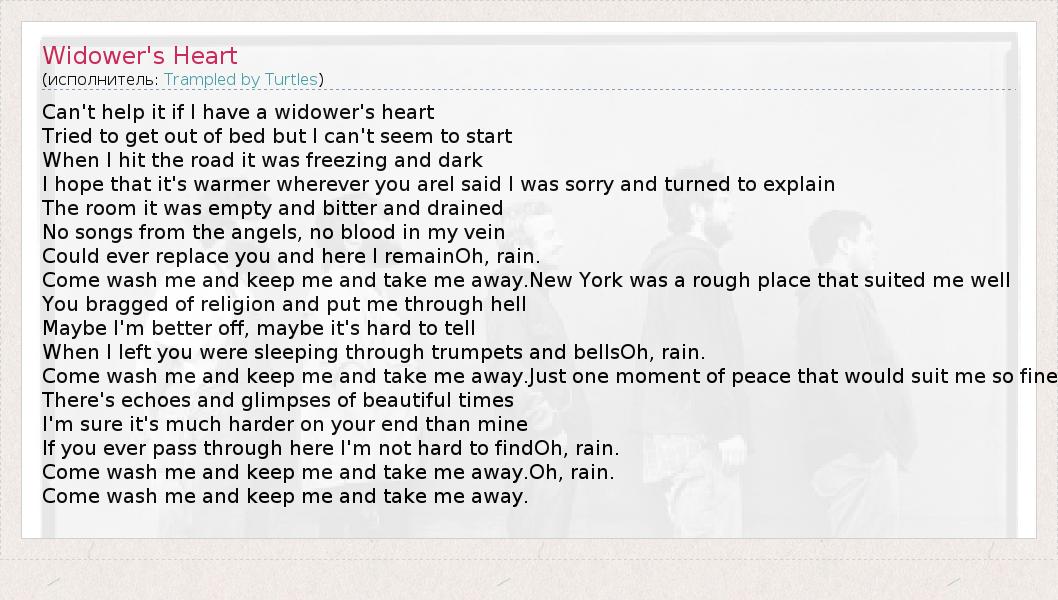 А как ты думаешь, о чем песня "Widower's Heart" ?