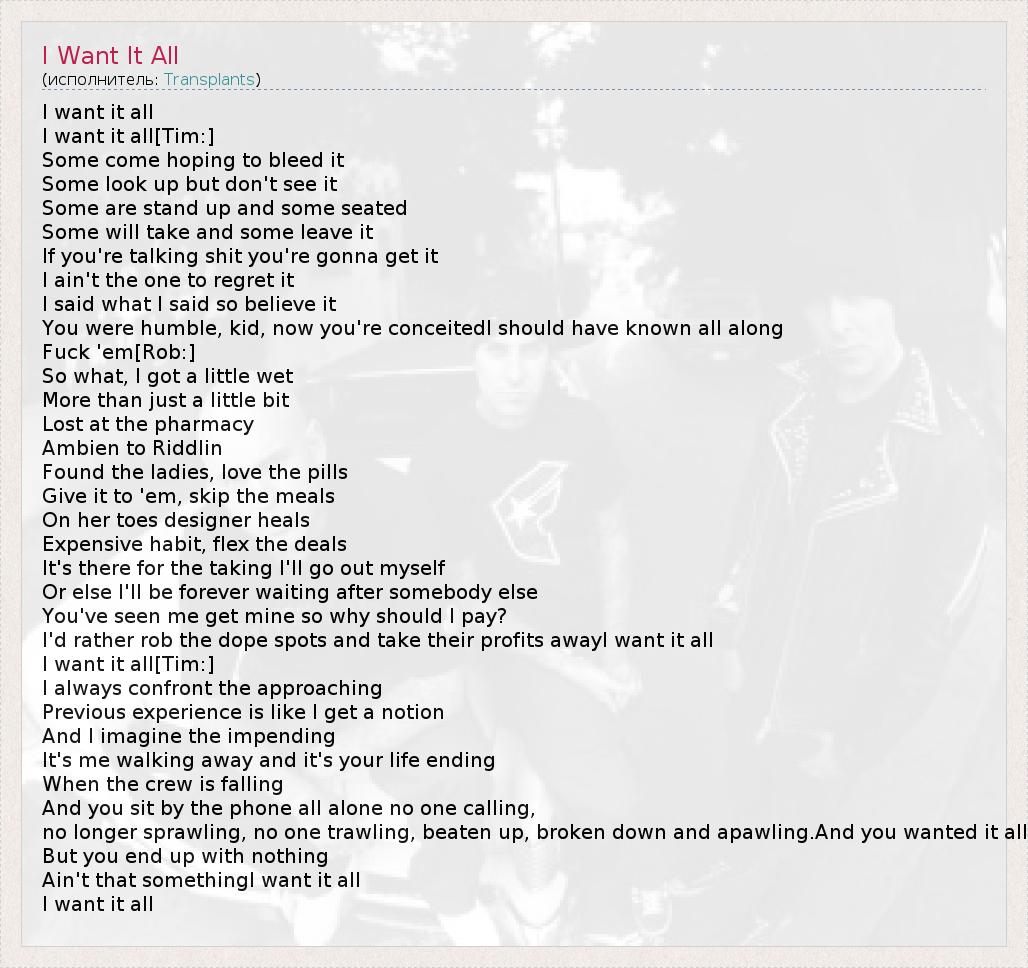 I want it all I want it all[Tim:] Some come hoping to bleed it Some look up but don't see it Some are stand up and some seated Some will take and some leave it If you're talking shit you're gonna get it I ain't the one to regret it I said what I said so believe it You were humble, kid, now you're conceitedI should have known all along Fuck 'em[Rob:] So what, I got a little wet More than just a little bit Lost at the pharmacy Ambien to Riddlin Found the ladies, love the pills Give it to 'em, skip the meals On her toes designer heals Expensive habit, flex the deals It's there for the taking I'll go out myself Or else I'll be forever waiting after somebody else You've seen me get mine so why should I pay? I'd rather rob the dope spots and take their profits awayI want it all I want it all[Tim:] I always confront the approaching Previous experience is like I get a notion And I imagine the impending It's me walking away and it's your life ending When the crew is falling And you sit by the phone all alone no one calling, no longer sprawling, no one trawling, beaten up, broken down and apawling.And you wanted it all But you end up with nothing Ain't that somethingI want it all I want it all