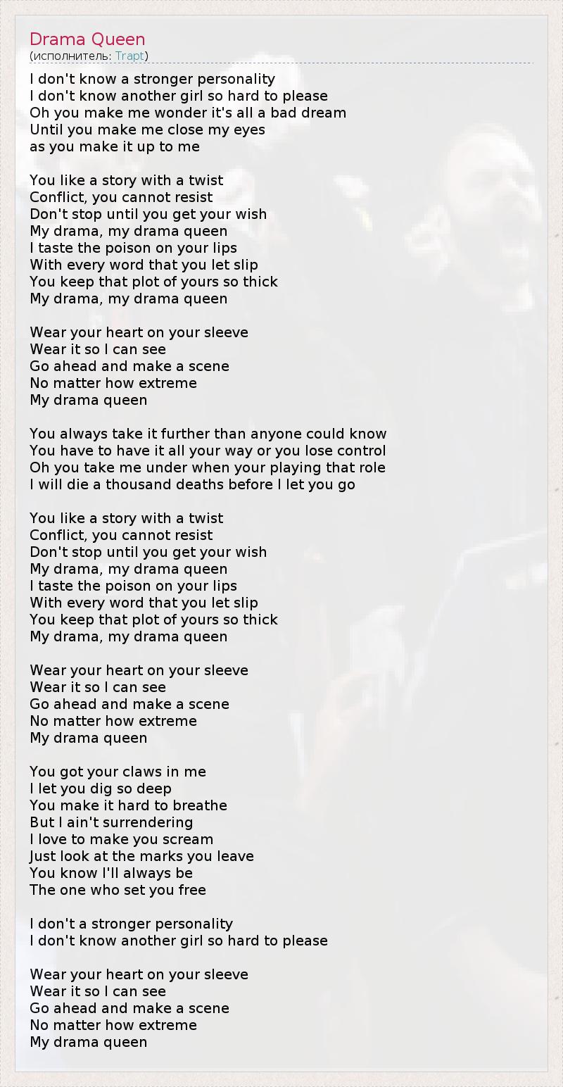 Я не знаю более сильной личности, Я не знаю другой такой девушки, которой так трудно угодить, О, ты заставляешь меня гадать, а не дурной ли сон это, Пока не заставишь меня закрыть глаза и мы не помиримся Ты словно история с закрученным сюжетом, Конфликт, которому не можешь противиться. Не останавливайся, пока не получишь желаемое, Моя королева драмы, Я чувствую вкус яда на твоих губах, Вместе с каждым словом, что ты бросаешь, Ты удерживаешь интригу, что так невообразима, Моя королева драмы Будь откровенна, Так, чтоб я смог увидеть, Давай, устрой сцену, Неважно, насколько опасной она будет, Моя королева драмы Ты всегда заходишь дальше, чем кто-либо мог подумать, Ты должна получить все от жизни, а иначе теряешь контроль, О, ты втягиваешь меня, когда играешь эту роль, Я умру тысячу раз, прежде чем отпущу тебя Ты словно история с закрученным сюжетом, Конфликт, которому не можешь противиться. Не останавливайся, пока не получишь желаемое, Моя королева драмы, Я чувствовал вкус яда на твоих губах, Вместе с каждым словом, что ты бросаешь, Ты удерживаешь интригу, что так невообразима, Моя королева драмы Будь откровенна, Так, чтоб я смог увидеть, Давай, устрой сцену, Неважно, насколько опасной она будет, Моя королева драмы Ты вонзаешь в меня свои коготки, Я позволю тебе пустить их так глубоко, Ты душишь меня, Но я не сдаюсь, Мне нравится заставлять тебя кричать, Только посмотри на следы, что ты оставляешь, Ты знаешь, я всегда буду тем, Кто освободит тебя Я не знаю более сильной личности, Я не знаю другой такой девушки, которой так трудно угодить Будь откровенна, Так, чтоб я смог увидеть, Давай, устрой сцену, Неважно, насколько опасной она будет, Моя королева драмы