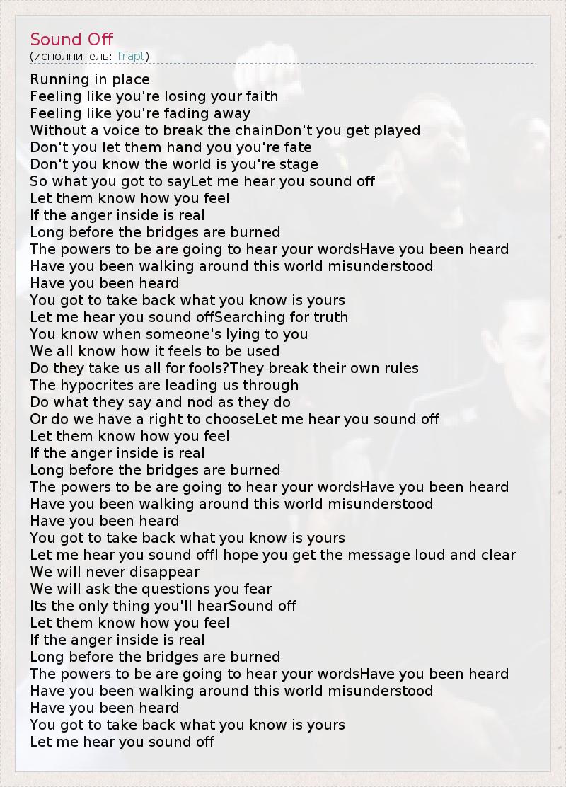 Running in place Feeling like you're losing your faith Feeling like you're fading away Without a voice to break the chainDon't you get played Don't you let them hand you you're fate Don't you know the world is you're stage So what you got to sayLet me hear you sound off Let them know how you feel If the anger inside is real Long before the bridges are burned The powers to be are going to hear your wordsHave you been heard Have you been walking around this world misunderstood Have you been heard You got to take back what you know is yours Let me hear you sound offSearching for truth You know when someone's lying to you We all know how it feels to be used Do they take us all for fools?They break their own rules The hypocrites are leading us through Do what they say and nod as they do Or do we have a right to chooseLet me hear you sound off Let them know how you feel If the anger inside is real Long before the bridges are burned The powers to be are going to hear your wordsHave you been heard Have you been walking around this world misunderstood Have you been heard You got to take back what you know is yours Let me hear you sound offI hope you get the message loud and clear We will never disappear We will ask the questions you fear Its the only thing you'll hearSound off Let them know how you feel If the anger inside is real Long before the bridges are burned The powers to be are going to hear your wordsHave you been heard Have you been walking around this world misunderstood Have you been heard You got to take back what you know is yours Let me hear you sound off