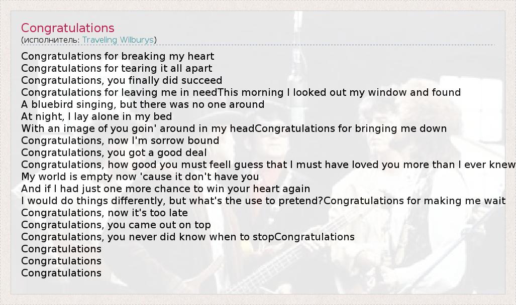 Congratulations, how good you must feelI guess that I must have loved you more than I ever knew