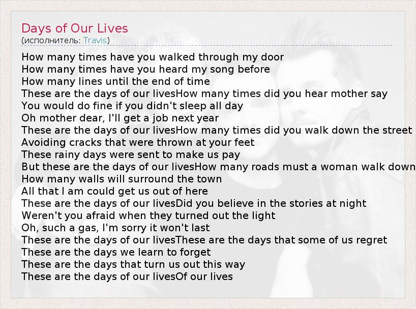 А как ты думаешь, о чем песня "Days of Our Lives" ?