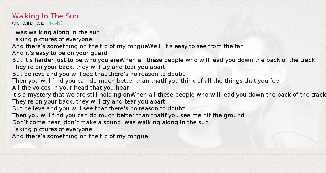 I was walking along in the sun Taking pictures of everyone And there's something on the tip of my tongueWell, it's easy to see from the far And it's easy to be on your guard But it's harder just to be who you areWhen all these people who will lead you down the back of the track They're on your back, they will try and tear you apart But believe and you will see that there's no reason to doubt Then you will find you can do much better than thatIf you think of all the things that you feel All the voices in your head that you hear It's a mystery that we are still holding onWhen all these people who will lead you down the back of the track They're on your back, they will try and tear you apart But believe and you will see that there's no reason to doubt Then you will find you can do much better than thatIf you see me hit the ground Don't come near, don't make a soundI was walking along in the sun Taking pictures of everyone And there's something on the tip of my tongue