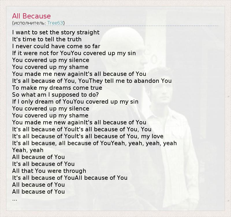 I want to set the story straight It's time to tell the truth I never could have come so far If it were not for YouYou covered up my sin You covered up my silence You covered up my shame You made me new againIt's all because of You It's all because of You, YouThey tell me to abandon You To make my dreams come true So what am I supposed to do? If I only dream of YouYou covered up my sin You covered up my silence You covered up my shame You made me new againIt's all because of You It's all because of YouIt's all because of You, You It's all because of YouIt's all because of You, my love It's all because, all because of YouYeah, yeah, yeah, yeah Yeah, yeah All because of You It's all because of You All that You were through It's all because of YouAll because of You All because of You All because of You ...