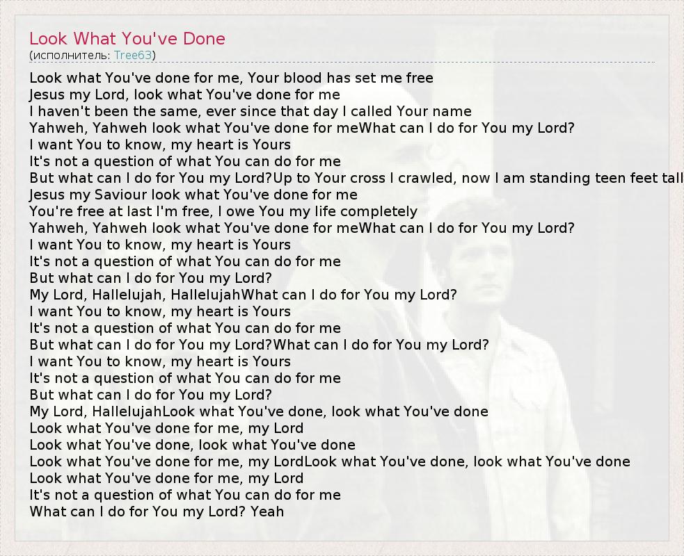 Look what You've done for me, Your blood has set me free Jesus my Lord, look what You've done for me I haven't been the same, ever since that day I called Your name Yahweh, Yahweh look what You've done for meWhat can I do for You my Lord? I want You to know, my heart is Yours It's not a question of what You can do for me But what can I do for You my Lord?Up to Your cross I crawled, now I am standing teen feet tall Jesus my Saviour look what You've done for me You're free at last I'm free, I owe You my life completely Yahweh, Yahweh look what You've done for meWhat can I do for You my Lord? I want You to know, my heart is Yours It's not a question of what You can do for me But what can I do for You my Lord? My Lord, Hallelujah, HallelujahWhat can I do for You my Lord? I want You to know, my heart is Yours It's not a question of what You can do for me But what can I do for You my Lord?What can I do for You my Lord? I want You to know, my heart is Yours It's not a question of what You can do for me But what can I do for You my Lord? My Lord, HallelujahLook what You've done, look what You've done Look what You've done for me, my Lord Look what You've done, look what You've done Look what You've done for me, my LordLook what You've done, look what You've done Look what You've done for me, my Lord It's not a question of what You can do for me What can I do for You my Lord? Yeah