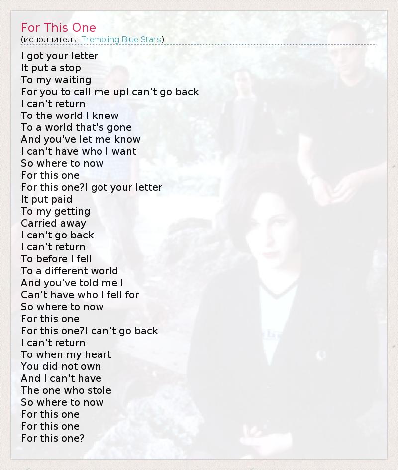 I got your letter It put a stop To my waiting For you to call me upI can't go back I can't return To the world I knew To a world that's gone And you've let me know I can't have who I want So where to now For this one For this one?I got your letter It put paid To my getting Carried away I can't go back I can't return To before I fell To a different world And you've told me I Can't have who I fell for So where to now For this one For this one?I can't go back I can't return To when my heart You did not own And I can't have The one who stole So where to now For this one For this one For this one?