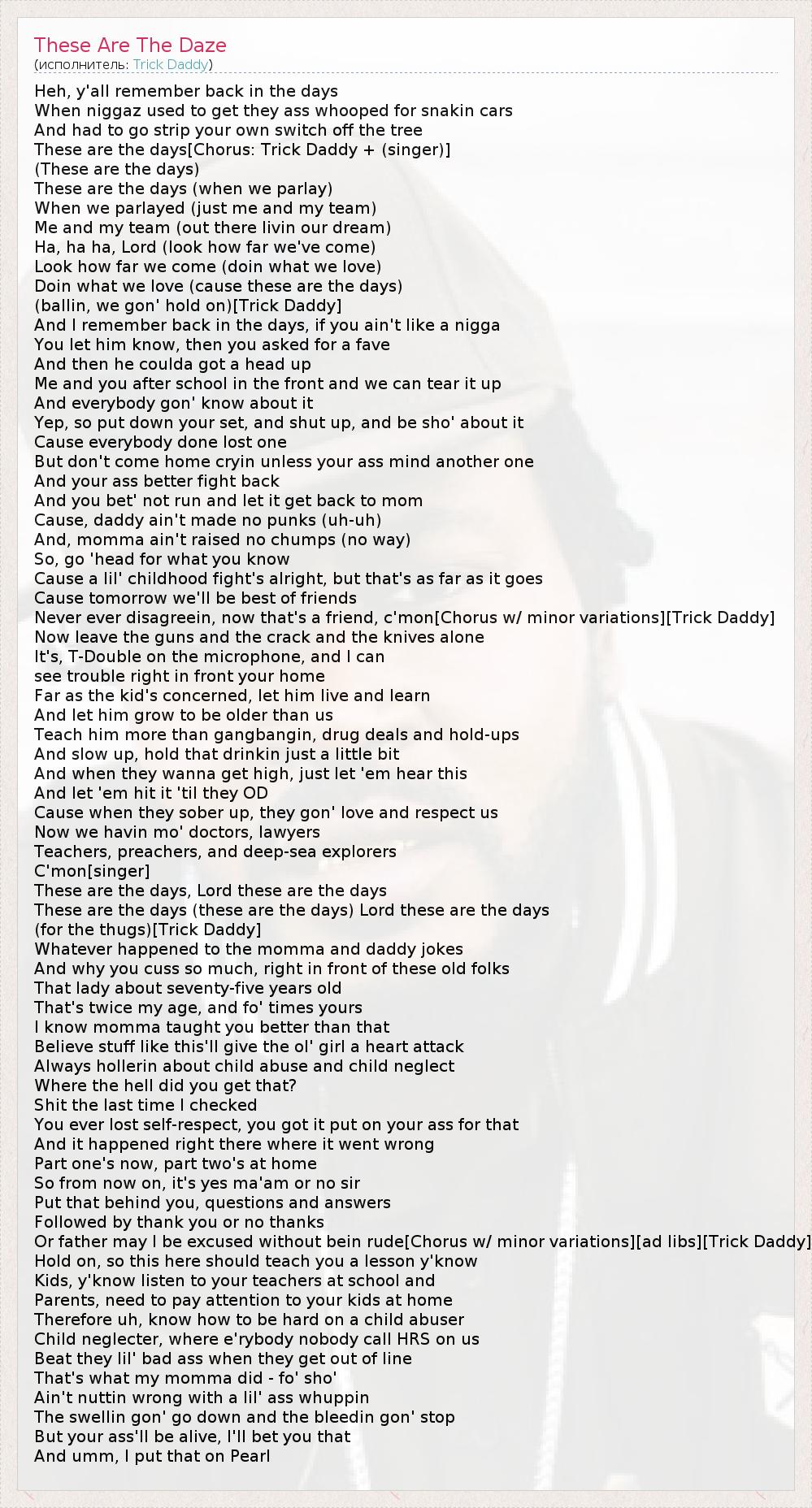 Это интересно:ВступлениеTrick Daddy (Maurice Young) родился 23 ноября, 1973 года в Liberty City - район Майами, штат Флорида. Trick, также известный под псевдонимами Trick Daddy Dollars и T-Double-D, серьезно начал заниматься рэпом ещё в далеких 80, и занимался он тогда на Underground сцене в его родном Майами. И тогда же выступая в одном из клубов его замечает Ted Lucas, который был организатором многочисленных концертов и администратором... продолжение