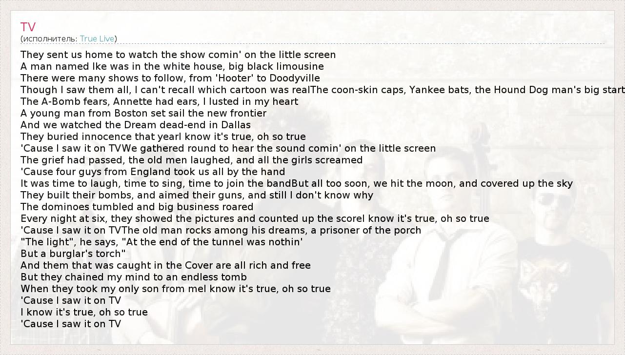 They sent us home to watch the show comin' on the little screen A man named Ike was in the white house, big black limousine There were many shows to follow, from 'Hooter' to Doodyville Though I saw them all, I can't recall which cartoon was realThe coon-skin caps, Yankee bats, the Hound Dog man's big start The A-Bomb fears, Annette had ears, I lusted in my heart A young man from Boston set sail the new frontier And we watched the Dream dead-end in Dallas They buried innocence that yearI know it's true, oh so true 'Cause I saw it on TVWe gathered round to hear the sound comin' on the little screen The grief had passed, the old men laughed, and all the girls screamed 'Cause four guys from England took us all by the hand It was time to laugh, time to sing, time to join the bandBut all too soon, we hit the moon, and covered up the sky They built their bombs, and aimed their guns, and still I don't know why The dominoes tumbled and big business roared Every night at six, they showed the pictures and counted up the scoreI know it's true, oh so true 'Cause I saw it on TVThe old man rocks among his dreams, a prisoner of the porch "The light", he says, "At the end of the tunnel was nothin' But a burglar's torch" And them that was caught in the Cover are all rich and free But they chained my mind to an endless tomb When they took my only son from meI know it's true, oh so true 'Cause I saw it on TV I know it's true, oh so true 'Cause I saw it on TV