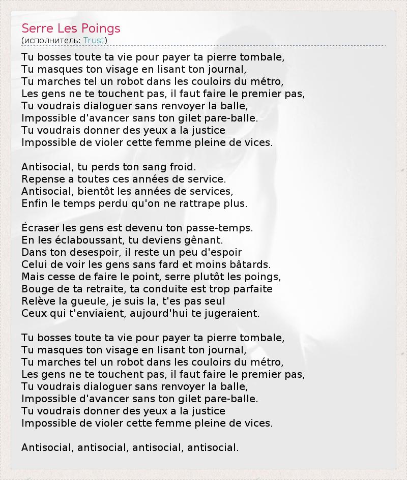 Ты ишачишь всю свою жизнь, чтобы заплатить за свой надгробный камень. Ты скрываешь своё лицо, читая свою газету. Ты вышагиваешь словно робот в проходах метро. Люди не касаются тебя, стоит сделать первый шаг. Тебе хотелось бы начать диалог, не прилагая усилий. Невозможно двигаться вперед без своего пуленепробиваемого жилета. Тебе хотелось бы посмотреть в глаза правосудию. Невозможно применить насилие к этой женщине, полной изъянов. Антиобщественный человек, ты теряешь свое хладнокровие, Вновь думая обо всех этих годах службы. Антиобщественный человек, годы службы В действительности потерянное время, что никогда не вернешь. Топтать людей стало твоим времяпровождением. Поливая их грязью, ты становишься неприятный. В твоем отчаянии остается немного надежды, Увидеть людей без бремени и менее фальшивыми. Но прекрати разбираться в своем положении, сожми лучше кулаки, Сойди с места, твое поведение слишком идеально. Прекрати орать, я здесь, ты не одинок. Те, кто завидовали тебе, сегодня осудили бы тебя. Ты ишачишь всю свою жизнь, чтобы заплатить за свой надгробный камень. Ты скрываешь своё лицо, читая свою газету. Ты вышагиваешь словно робот в проходах метро. Люди не касаются тебя, стоит сделать первый шаг. Тебе хотелось бы начать диалог, не прилагая усилий. Невозможно двигаться вперед без своего пуленепробиваемого жилета. Тебе хотелось бы посмотреть в глаза правосудию. Невозможно применить насилие к этой женщине, полной изъянов. Антиобщественный, антиобщественный, антиобщественный, антиобщественный человек.