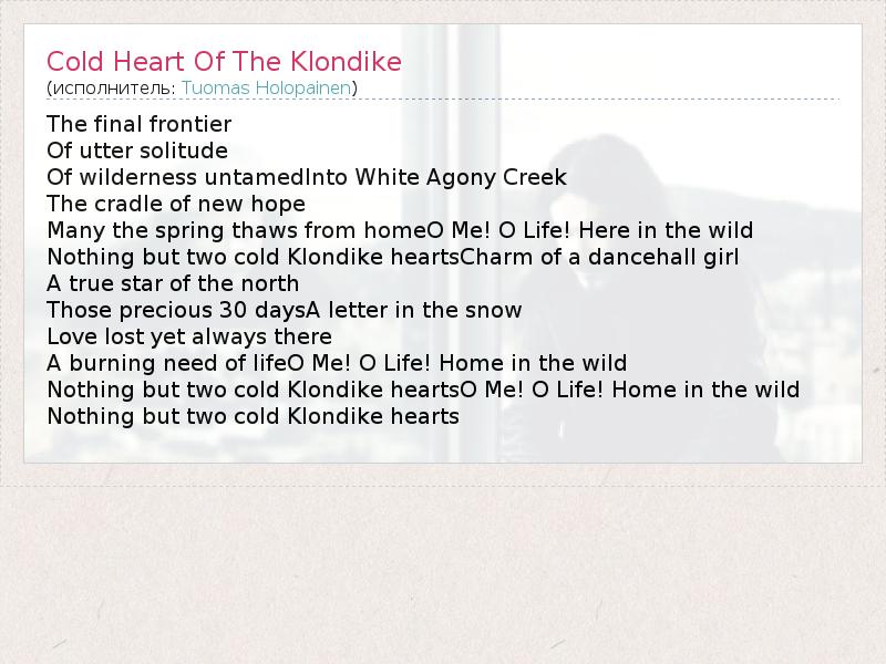 А как ты думаешь, о чем песня "Cold Heart Of The Klondike" ?