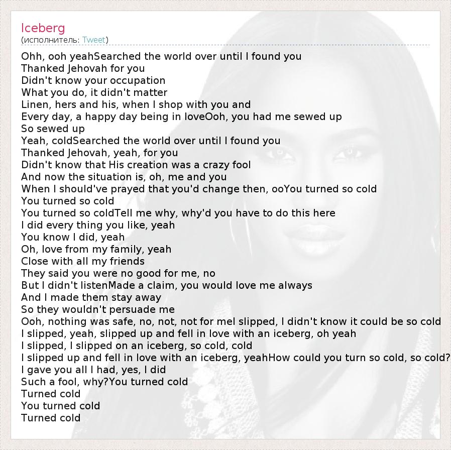 Ohh, ooh yeahSearched the world over until I found you Thanked Jehovah for you Didn't know your occupation What you do, it didn't matter Linen, hers and his, when I shop with you and Every day, a happy day being in loveOoh, you had me sewed up So sewed up Yeah, coldSearched the world over until I found you Thanked Jehovah, yeah, for you Didn't know that His creation was a crazy fool And now the situation is, oh, me and you When I should've prayed that you'd change then, ooYou turned so cold You turned so cold You turned so coldTell me why, why'd you have to do this here I did every thing you like, yeah You know I did, yeah Oh, love from my family, yeah Close with all my friends They said you were no good for me, no But I didn't listenMade a claim, you would love me always And I made them stay away So they wouldn't persuade me Ooh, nothing was safe, no, not, not for meI slipped, I didn't know it could be so cold I slipped, yeah, slipped up and fell in love with an iceberg, oh yeah I slipped, I slipped on an iceberg, so cold, cold I slipped up and fell in love with an iceberg, yeahHow could you turn so cold, so cold? I gave you all I had, yes, I did Such a fool, why?You turned cold Turned cold You turned cold Turned cold