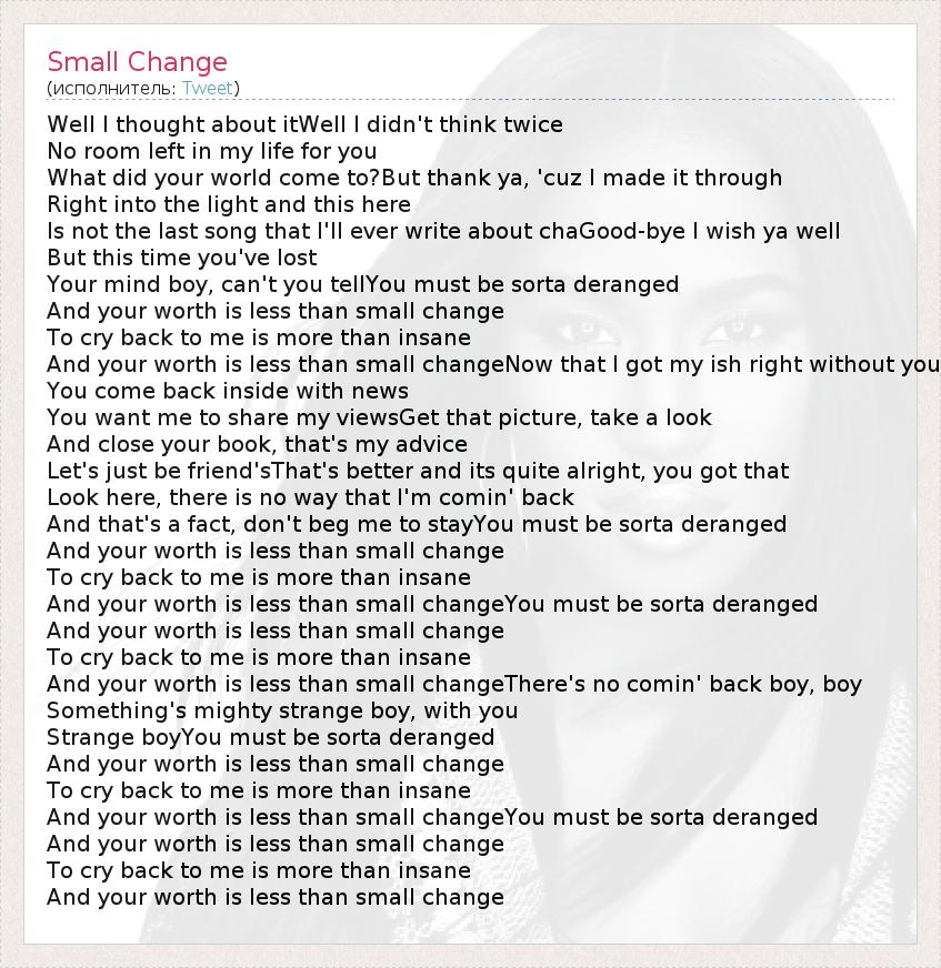Это интересно:Tweet пела, играла на различных инструментах, и писала песни с тех самых пор, как помнит себя, однако шесть лет труда по контракту со звукозаписывающей компанией подкосили ее и заставили почувствовать себя поверженной.Разбитая переживаниями, девушка прожила какое-то время одна в доме своих родителей во Флориде. Tweet настолько глубоко погрузилась в депрессию, что даже хотела покончить... продолжение