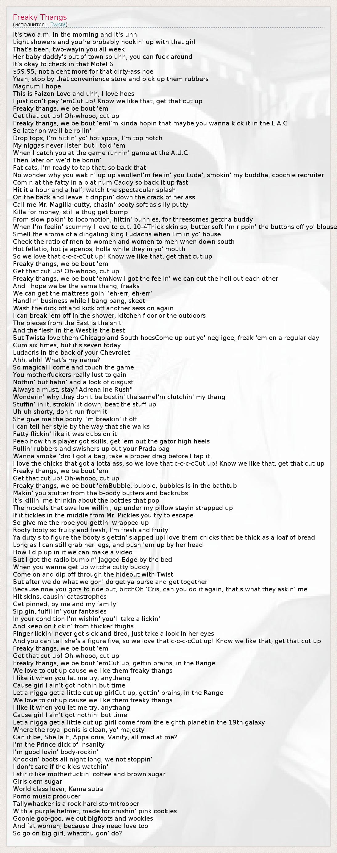 It's two a.m. in the morning and it's uhh Light showers and you're probably hookin' up with that girl That's been, two-wayin you all week Her baby daddy's out of town so uhh, you can fuck around It's okay to check in that Motel 6 $59.95, not a cent more for that dirty-ass hoe Yeah, stop by that convenience store and pick up them rubbers Magnum I hope This is Faizon Love and uhh, I love hoes I just don't pay 'emCut up! Know we like that, get that cut up Freaky thangs, we be bout 'em Get that cut up! Oh-whooo, cut up Freaky thangs, we be bout 'emI'm kinda hopin that maybe you wanna kick it in the L.A.C So later on we'll be rollin' Drop tops, I'm hittin' yo' hot spots, I'm top notch My niggas never listen but I told 'em When I catch you at the game runnin' game at the A.U.C Then later on we'd be bonin' Fat cats, I'm ready to tap that, so back that No wonder why you wakin' up up swollenI'm feelin' you Luda', smokin' my buddha, coochie recruiter Comin at the fatty in a platinum Caddy so back it up fast Hit it a hour and a half, watch the spectacular splash On the back and leave it drippin' down the crack of her ass Call me Mr. Magilla-cutty, chasin' booty soft as silly putty Killa for money, still a thug get bump From slow pokin' to locomotion, hittin' bunnies, for threesomes getcha buddy When I'm feelin' scummy I love to cut, 10-4Thick skin so, butter soft I'm rippin' the buttons off yo' blouse Smell the aroma of a dingaling king Ludacris when I'm in yo' house Check the ratio of men to women and women to men when down south Hot fellatio, hot jalapenos, holla while they in yo' mouth So we love that c-c-c-cCut up! Know we like that, get that cut up Freaky thangs, we be bout 'em Get that cut up! Oh-whooo, cut up Freaky thangs, we be bout 'emNow I got the feelin' we can cut the hell out each other And I hope we be the same thang, freaks We can get the mattress goin' 'eh-err, eh-err' Handlin' business while I bang bang, skeet Wash the dick off and kick off another session again I can break 'em off in the shower, kitchen floor or the outdoors The pieces from the East is the shit And the flesh in the West is the best But Twista love them Chicago and South hoesCome up out yo' negligee, freak 'em on a regular day Cum six times, but it's seven today Ludacris in the back of your Chevrolet Ahh, ahh! What's my name? So magical I come and touch the game You motherfuckers really lust to gain Nothin' but hatin' and a look of disgust Always a must, stay "Adrenaline Rush" Wonderin' why they don't be bustin' the sameI'm clutchin' my thang Stuffin' in it, strokin' it down, beat the stuff up Uh-uh shorty, don't run from it She give me the booty I'm breakin' it off I can tell her style by the way that she walks Fatty flickin' like it was dubs on it Peep how this player got skills, get 'em out the gator high heels Pullin' rubbers and swishers up out your Prada bag Wanna smoke 'dro I got a bag, take a proper drag before I tap it I love the chicks that got a lotta ass, so we love that c-c-c-cCut up! Know we like that, get that cut up Freaky thangs, we be bout 'em Get that cut up! Oh-whooo, cut up Freaky thangs, we be bout 'emBubble, bubble, bubbles is in the bathtub Makin' you stutter from the b-body butters and backrubs It's killin' me thinkin about the bottles that pop The models that swallow willin', up under my pillow stayin strapped up If it tickles in the middle from Mr. Pickles you try to escape So give me the rope you gettin' wrapped up Rooty tooty so fruity and fresh, I'm fresh and fruity Ya duty's to figure the booty's gettin' slapped upI love them chicks that be thick as a loaf of bread Long as I can still grab her legs, and push 'em up by her head How I dip up in it we can make a video But I got the radio bumpin' Jagged Edge by the bed When you wanna get up witcha cutty buddy Come on and dip off through the hideout with Twist' But after we do what we gon' do get ya purse and get together Because now you gots to ride out, bitchOh 'Cris, can you do it again, that's what they askin' me Hit skins, causin' catastrophes Get pinned, by me and my family Sip gin, fulfillin' your fantasies In your condition I'm wishin' you'll take a lickin' And keep on tickin' from thicker thighs Finger lickin' never get sick and tired, just take a look in her eyes And you can tell she's a figure five, so we love that c-c-c-cCut up! Know we like that, get that cut up Freaky thangs, we be bout 'em Get that cut up! Oh-whooo, cut up Freaky thangs, we be bout 'emCut up, gettin brains, in the Range We love to cut up cause we like them freaky thangs I like it when you let me try, anythang Cause girl I ain't got nothin but time Let a nigga get a little cut up girlCut up, gettin' brains, in the Range We love to cut up cause we like them freaky thangs I like it when you let me try, anythang Cause girl I ain't got nothin' but time Let a nigga get a little cut up girlI come from the eighth planet in the 19th galaxy Where the royal penis is clean, yo' majesty Can it be, Sheila E, Appalonia, Vanity, all mad at me? I'm the Prince dick of insanity I'm good lovin' body-rockin' Knockin' boots all night long, we not stoppin' I don't care if the kids watchin' I stir it like motherfuckin' coffee and brown sugar Girls dem sugar World class lover, Kama sutra Porno music producer Tallywhacker is a rock hard stormtrooper With a purple helmet, made for crushin' pink cookies Goonie goo-goo, we cut bigfoots and wookies And fat women, because they need love too So go on big girl, whatchu gon' do?