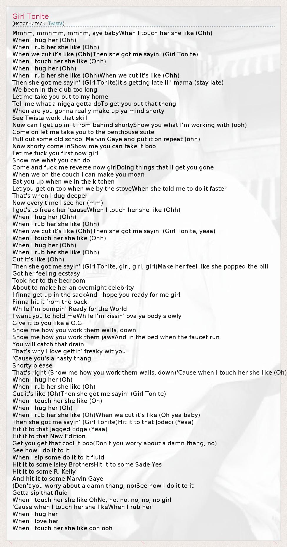 Mmhm, mmhmm, mmhm, aye babyWhen I touch her she like (Ohh) When I hug her (Ohh) When I rub her she like (Ohh) When we cut it's like (Ohh)Then she got me sayin' (Girl Tonite) When I touch her she like (Ohh) When I hug her (Ohh) When I rub her she like (Ohh)When we cut it's like (Ohh) Then she got me sayin' (Girl Tonite)It's getting late lil' mama (stay late) We been in the club too long Let me take you out to my home Tell me what a nigga gotta doTo get you out that thong When are you gonna really make up ya mind shorty See Twista work that skill Now can I get up in it from behind shortyShow you what I'm working with (ooh) Come on let me take you to the penthouse suite Pull out some old school Marvin Gaye and put it on repeat (ohh) Now shorty come inShow me you can take it boo Let me fuck you first now girl Show me what you can do Come and fuck me reverse now girlDoing things that'll get you gone When we on the couch I can make you moan Eat you up when we in the kitchen Let you get on top when we by the stoveWhen she told me to do it faster That's when I dug deeper Now every time I see her (mm) I got's to freak her 'causeWhen I touch her she like (Ohh) When I hug her (Ohh) When I rub her she like (Ohh) When we cut it's like (Ohh)Then she got me sayin' (Girl Tonite, yeaa) When I touch her she like (Ohh) When I hug her (Ohh) When I rub her she like (Ohh) Cut it's like (Ohh) Then she got me sayin' (Girl Tonite, girl, girl, girl)Make her feel like she popped the pill Got her feeling ecstasy Took her to the bedroom About to make her an overnight celebrity I finna get up in the sackAnd I hope you ready for me girl Finna hit it from the back While I'm bumpin' Ready for the World I want you to hold meWhile I'm kissin' ova ya body slowly Give it to you like a O.G. Show me how you work them walls, down Show me how you work them jawsAnd in the bed when the faucet run You will catch that drain That's why I love gettin' freaky wit you 'Cause you's a nasty thang Shorty please That's right (Show me how you work them walls, down)'Cause when I touch her she like (Oh) When I hug her (Oh) When I rub her she like (Oh) Cut it's like (Oh)Then she got me sayin' (Girl Tonite) When I touch her she like (Oh) When I hug her (Oh) When I rub her she like (Oh)When we cut it's like (Oh yea baby) Then she got me sayin' (Girl Tonite)Hit it to that Jodeci (Yeaa) Hit it to that Jagged Edge (Yeaa) Hit it to that New Edition Get you get that cool it boo(Don't you worry about a damn thang, no) See how I do it to it When I sip some do it to it fluid Hit it to some Isley BrothersHit it to some Sade Yes Hit it to some R. Kelly And hit it to some Marvin Gaye (Don't you worry about a damn thang, no)See how I do it to it Gotta sip that fluid When I touch her she like OhNo, no, no, no, no, no girl 'Cause when I touch her she likeWhen I rub her When I hug her When I love her When I touch her she like ooh ooh