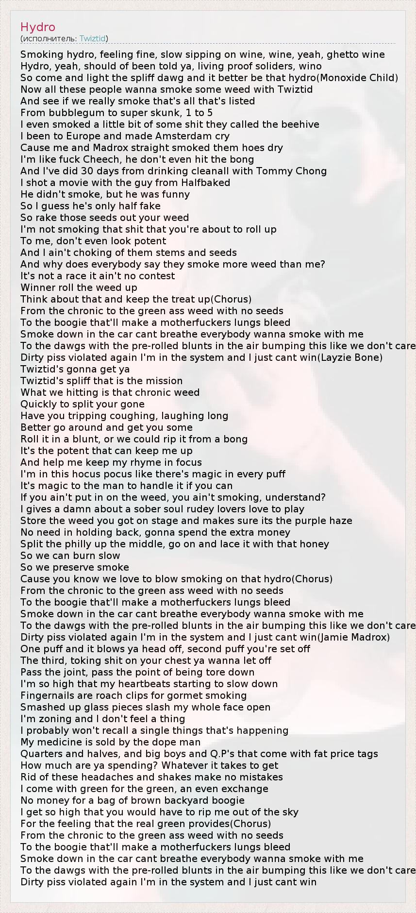 So come and light the spliff dawg and it better be that hydro(Monoxide Child)